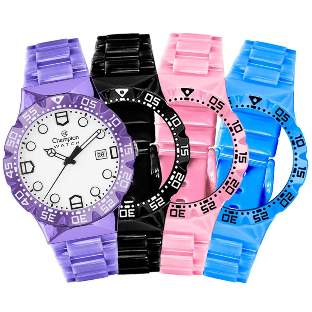 Relógio Champion Watch Troca Pulseiras com design esportivo e moderno, ideal para quem valoriza estilo e praticidade.O kit inclui 4 pulseiras e molduras intercambiáveis em diversas cores, além de cordão e gancho exclusivos.Com calendário e resistência à água, é perfeito para o dia a dia.Um relógio versátil, confortável e cheio de personalidade.Champion Watch: seu estilo muda com você.