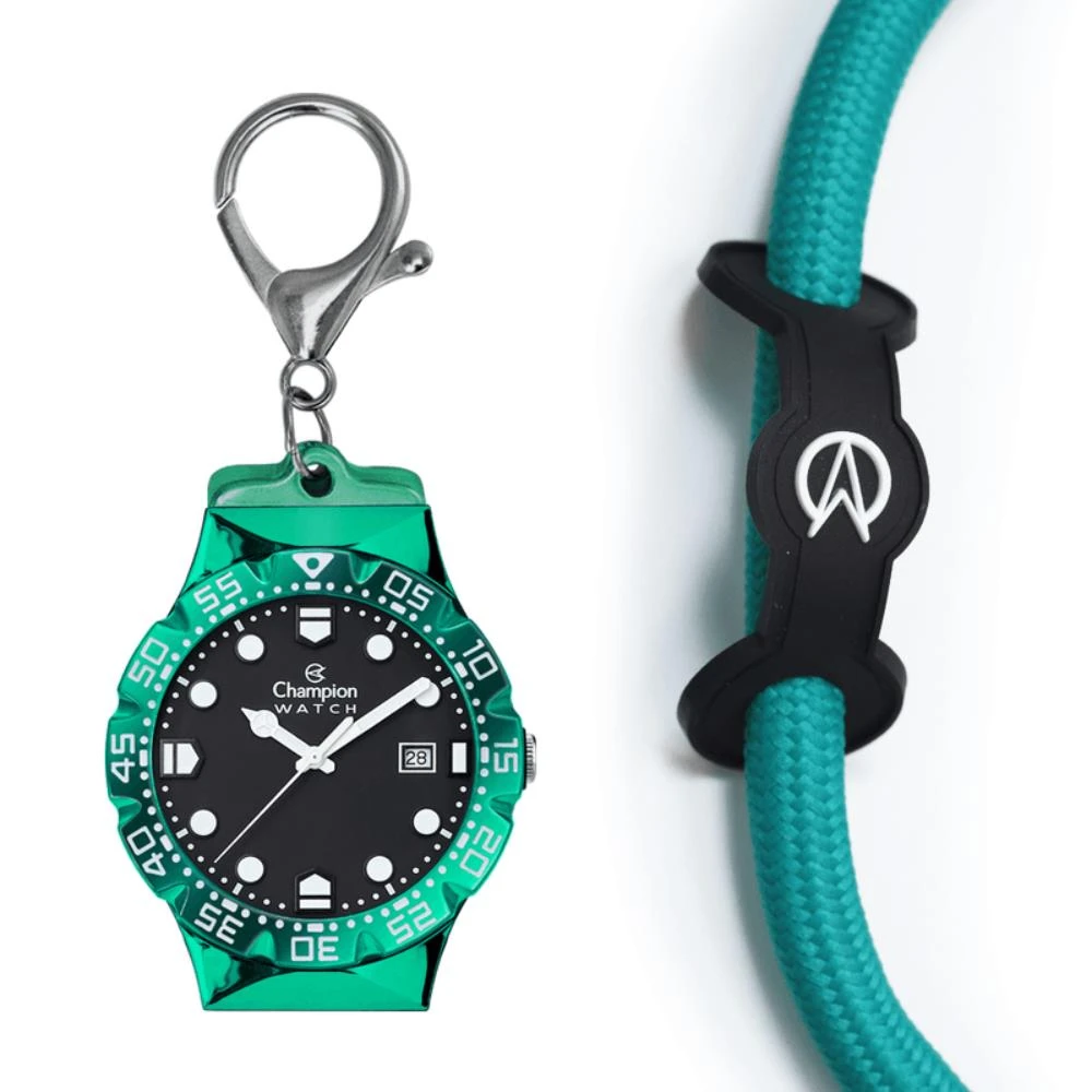 - Gancho para pendrar o relógio onde quiser (com base verde metálico)