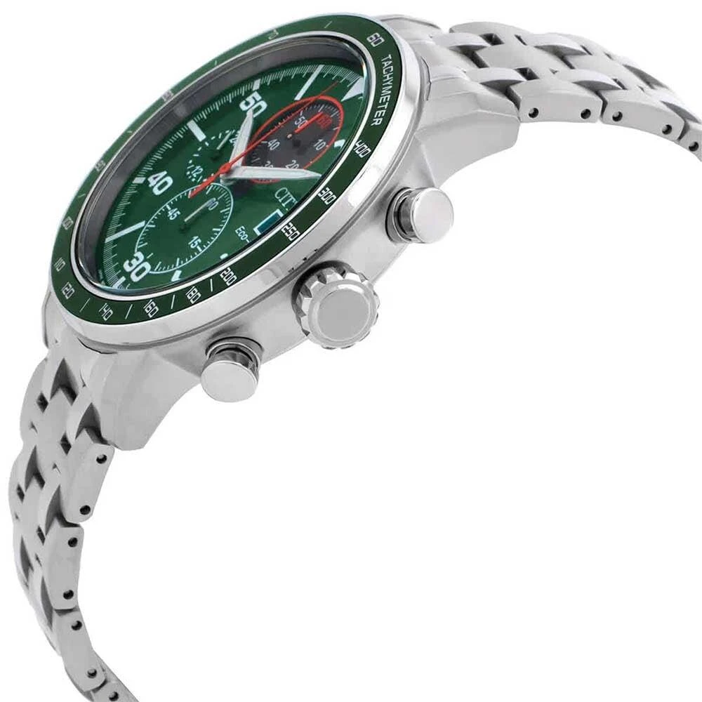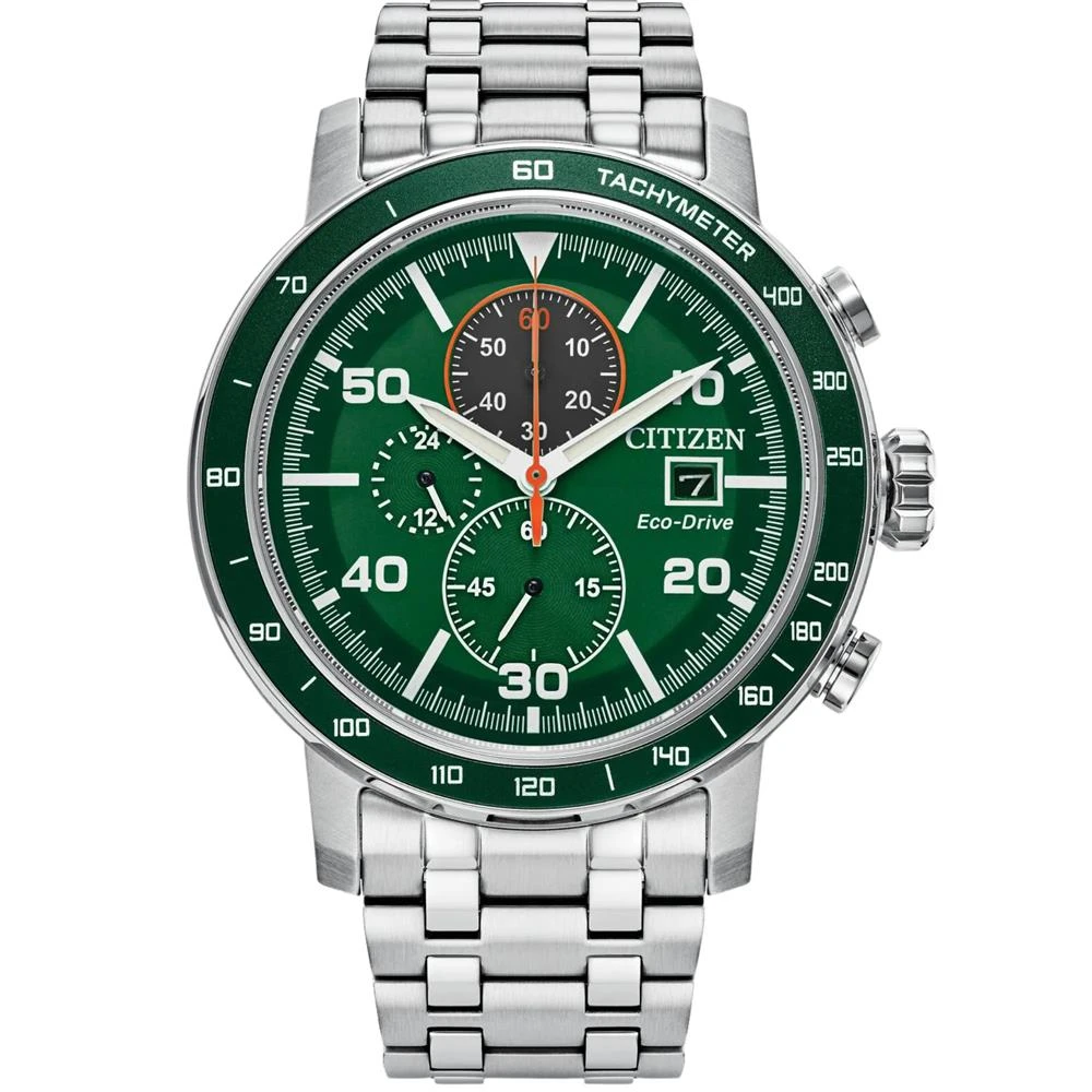 Funções: Analógico, Calendário, Solar, Cronógrafo, TaquímetroAlimentação do maquinário: Energia SolarMostrador Verde com númerosAro Fixo Verde com TaquímetroColeção: Citizen Brycen Eco-DriveGarantia de 2 Anos