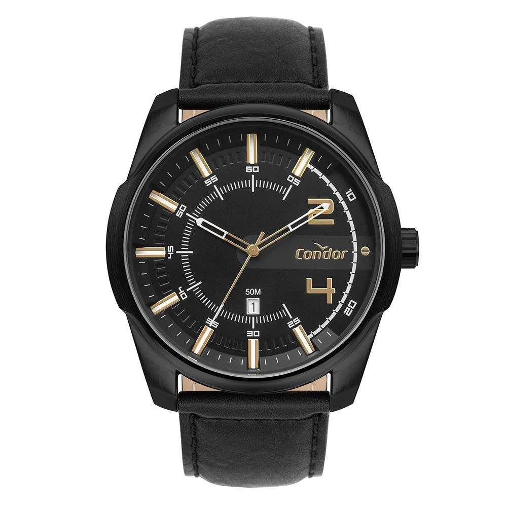 Caixa de MetalPulseira de Couro Ecológico PretaFundo de PressãoDiâmetro / Largura da Caixa: 50.00 MMFunções: Analógico, CalendárioResistente à água 5 ATMAlimentação do Maquinário: BateriaMaquina JaponesaMostrador Preto com números e detalhes em douradoGarantia de 1 Ano
