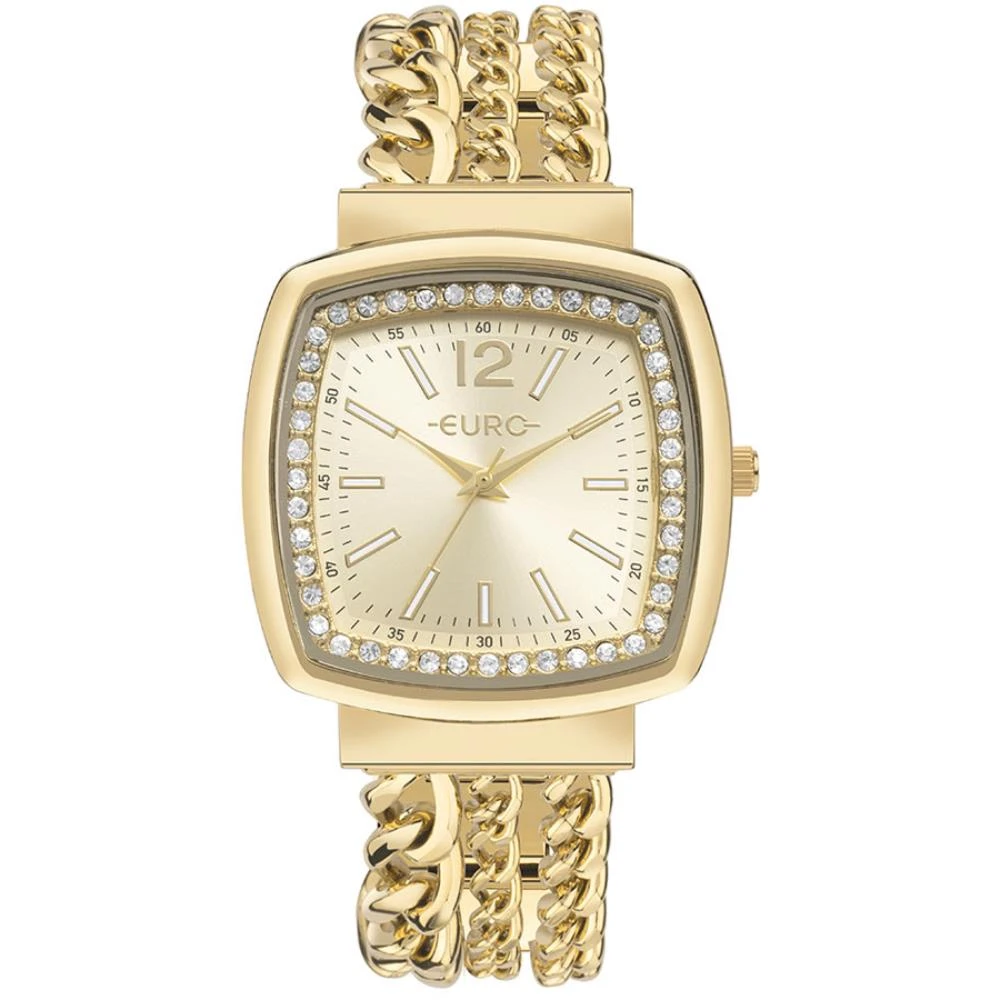 Caixa de MetalPulseira de Metal estilo braceleteVidro de Cristal MineralFundo PressãoResistente à Água Até 3 AtmDiâmetro / Largura da Caixa: 38.00 MM x 38.00 MMFunções: Analógico, BraceleteMostrador dourado com Número e pedrasAlimentação do Maquinário: BateriaMaquina Japonesa