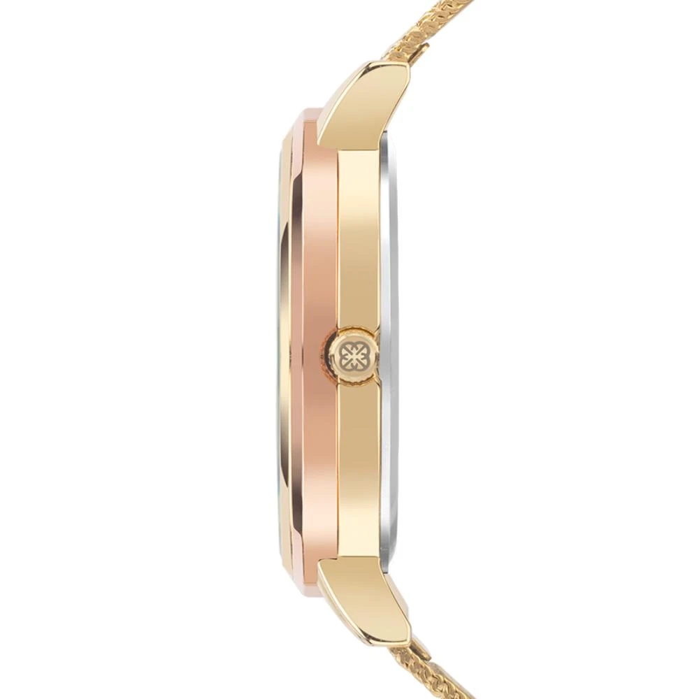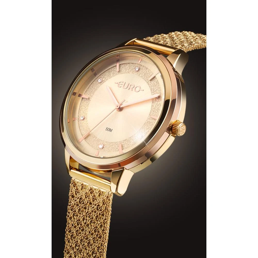 Caixa de MetalPulseira de Malha de Aço MeshVidro de Cristal MineralFundo PressãoResistente à Água Até 5 AtmDiâmetro / Largura da Caixa: 40.00 MMFunções: AnalógicoAro RoséMostrador champanhe com pedrasAlimentação do Maquinário: BateriaMaquina Japonesa