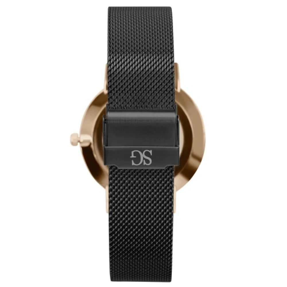 Relógio Feminino Preto Houston Rosé Gold 32mm Saint Germain. A caixa é de metal rosé gold e o mostrador preto, vidro com mineral endurecido com alta resistência.