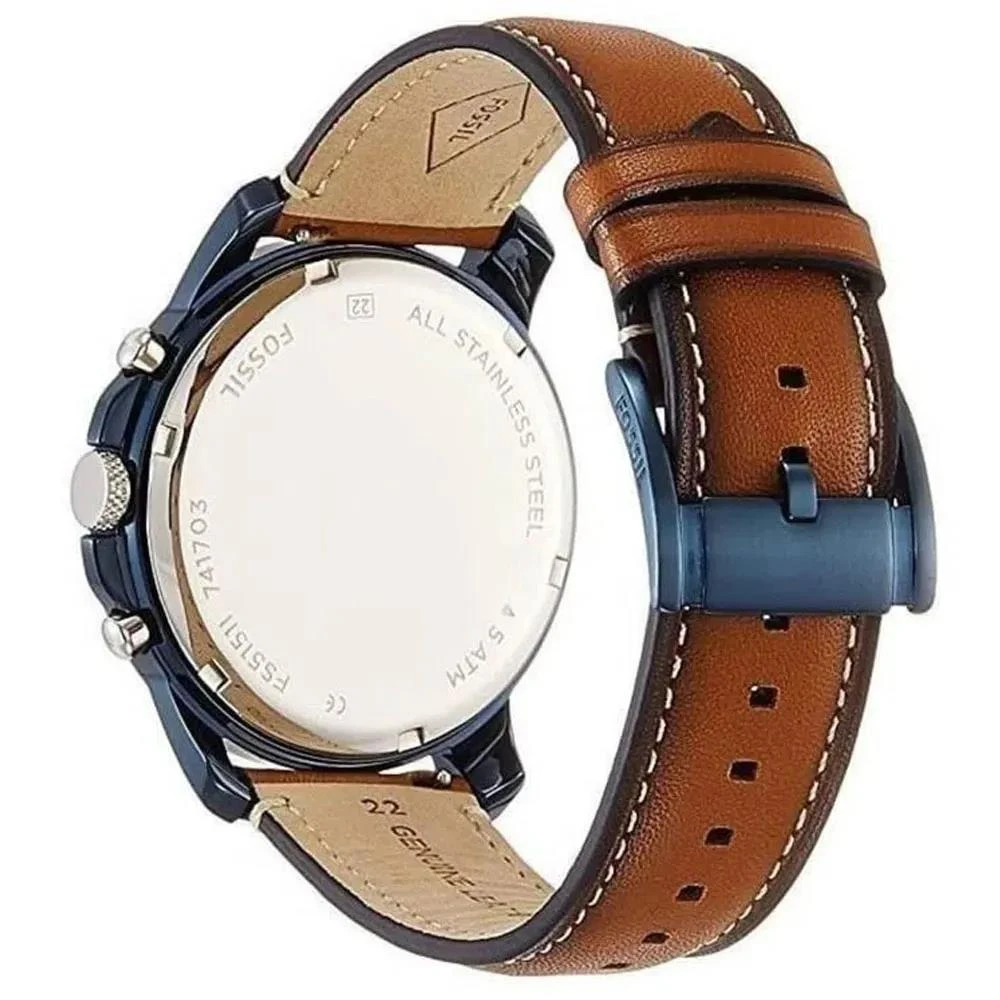 Caixa de Aço InoxidávelPulseira de Couro Legítimo MarromVidro de Cristal MineralFundo RosqueadoResistente à Água 5 AtmDiâmetro / Largura da Caixa: 44.00 MMAltura da Caixa: 12.00 MMLinha: Fossil GrantFunções: Analógico, Cronógrafo, Calendário Mensal Mostrador Azul com algarismos romanos e detalhes em prateadoAlimentação do Maquinário: BateriaGarantia de 2 Anos