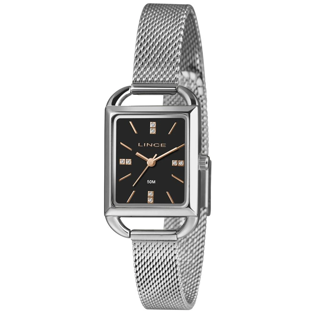 Caixa: MetalPulseira: Malha de Aço MeshMedida da caixa: 24 mm x 28 mmVidro: Cristal MineralResistência à água: 50mFunções: AnalógicoMostrador preto com pedrasFundo de PressãoAlimentação do maquinário: BateriaMaquinário JaponêsGarantia de 1 Ano