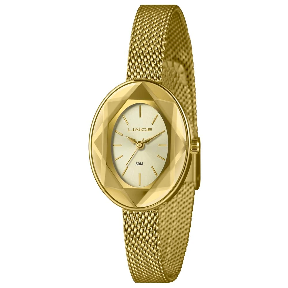 Caixa: MetalPulseira: Malha de Aço MeshMedida da caixa: 27 mm x 36 mmVidro: Cristal Mineral BisotêResistência à água: 50mFunções: AnalógicoMostrador DouradoFundo de PressãoAlimentação do Maquinário: BateriaMaquinário JaponêsGarantia de 1 Ano