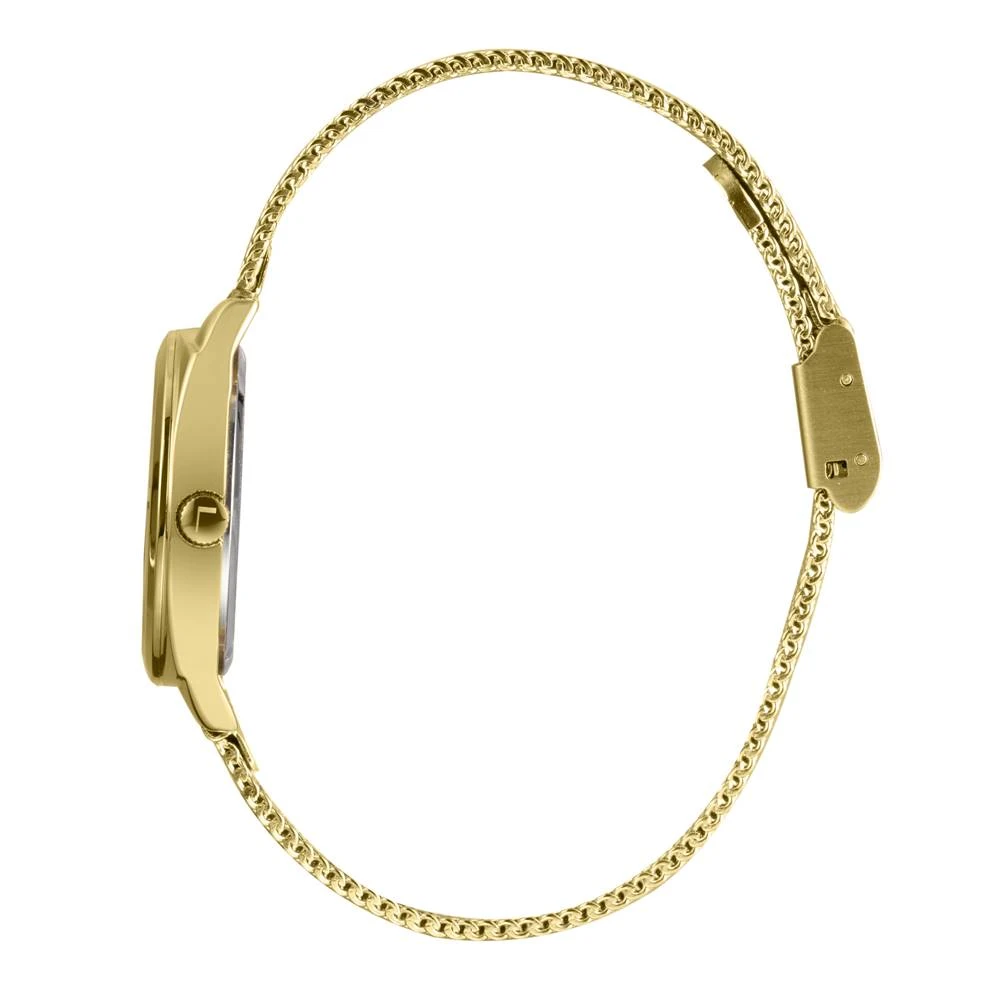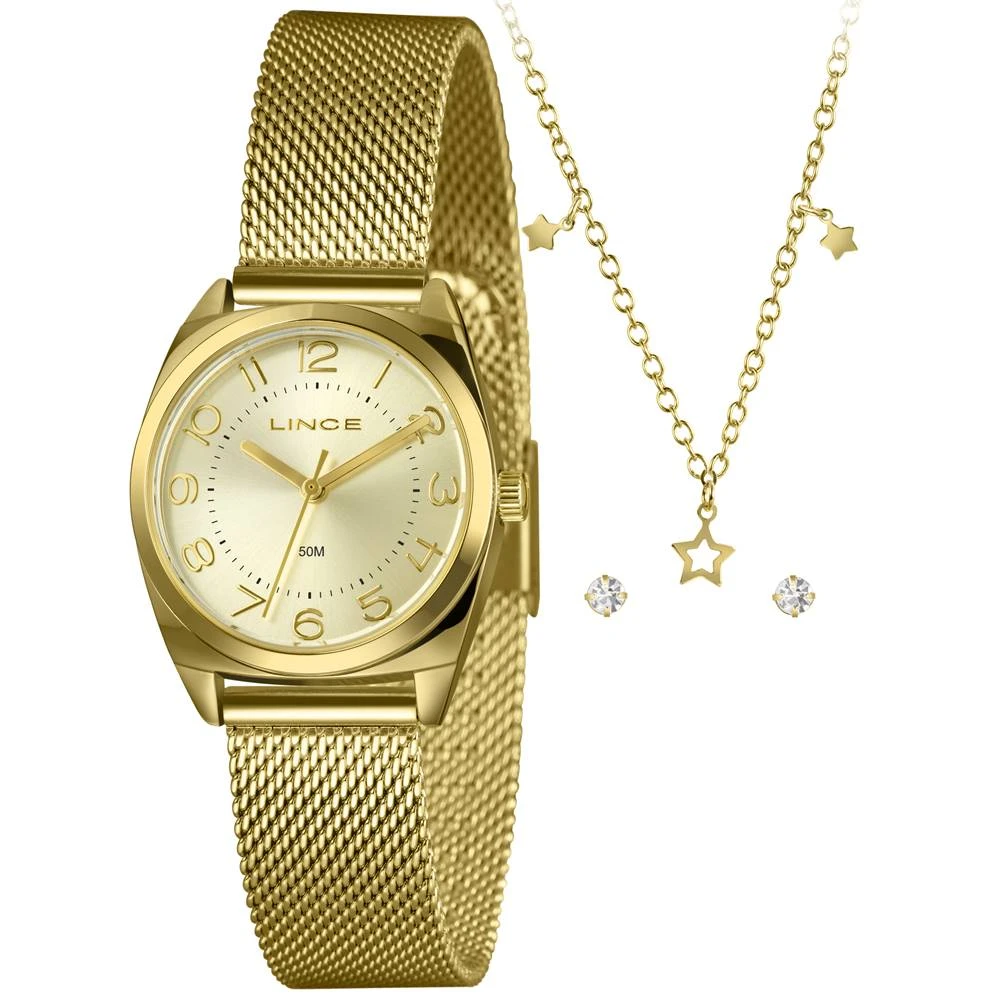 Caixa: MetalPulseira: Malha de Aço MeshMedida da caixa: 30 mmVidro: Cristal MineralResistência à água: 50mFunções: AnalógicoMostrador Dourado com Todos os NúmerosFundo de PressãoAlimentação do Maquinário: BateriaMaquinário Japonês+ Par de Brincos, Corrente e Pingente SemijoiaGarantia de 1 Ano