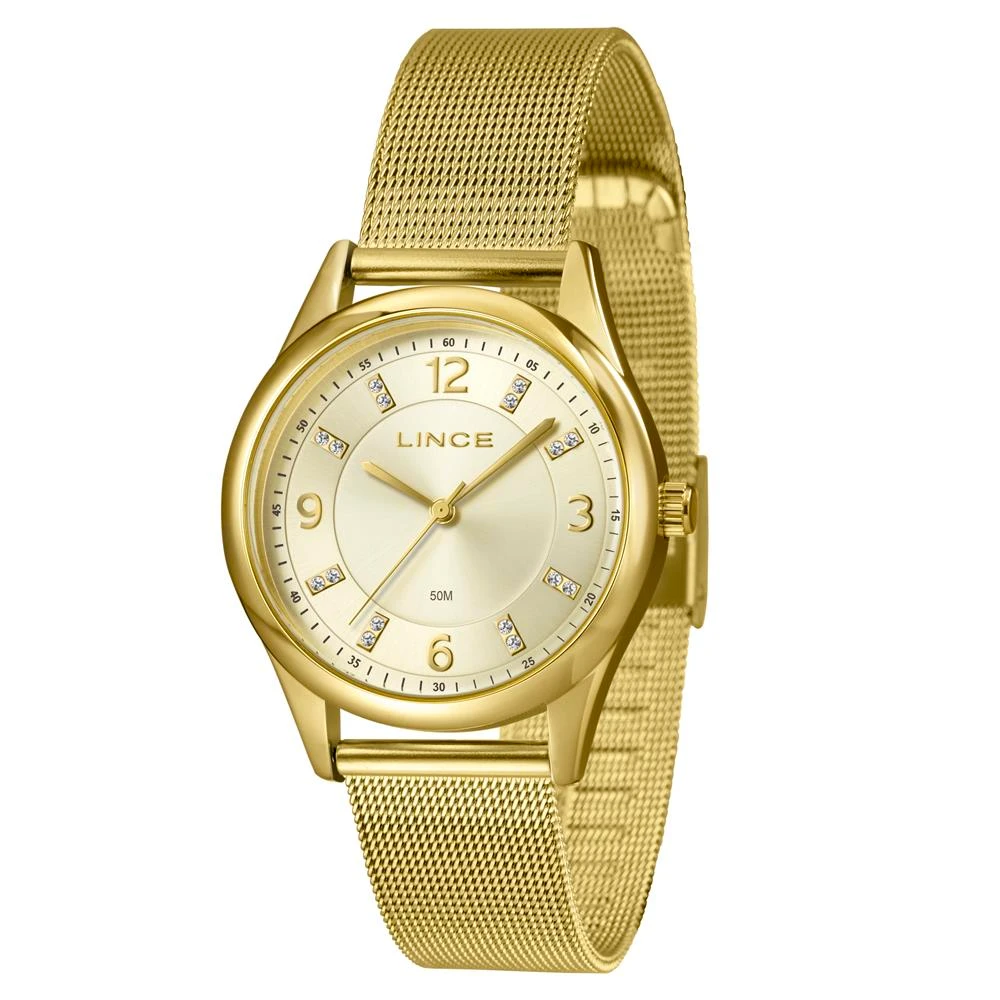 Caixa: MetalPulseira: Malha de Aço MeshMedida da caixa: 36 mmVidro: Cristal MineralResistência à água: 50mFunções: AnalógicoMostrador dourado com números e pedrasFundo de PressãoAlimentação do Maquinário: BateriaMaquinário JaponêsGarantia de 1 Ano