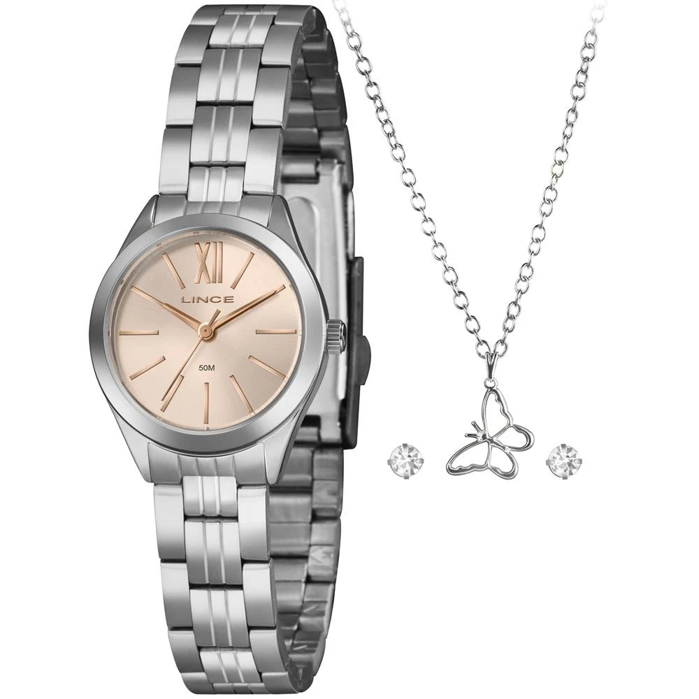 Caixa: MetalPulseira: AçoMedida da caixa: 25 mmVidro: Cristal MineralResistência à água: 50mFunções: AnalógicoMostrador rosé com algarismo romanoFundo de PressãoAlimentação do Maquinário: BateriaMaquinário Japonês+ Par de Brincos, Corrente e Pingente SemijoiaGarantia de 1 Ano