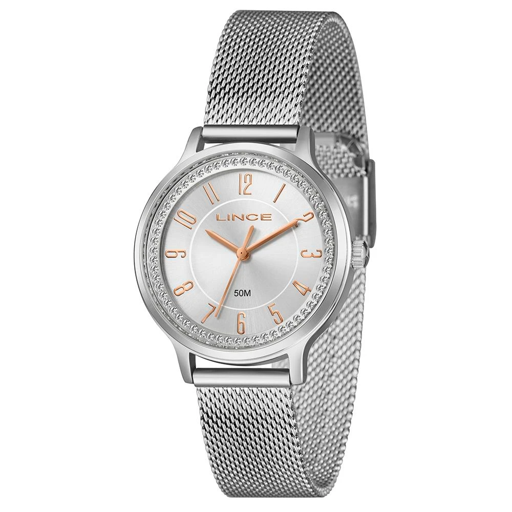 Caixa: MetalPulseira: Malha de Aço MeshMedida da caixa: 36 mmVidro: Cristal MineralResistência à água: 50mFunções: AnalógicoMostrador Prateado com todos os números e pedrasFundo de PressãoAlimentação do Maquinário: BateriaMaquinário JaponêsGarantia de 1 Ano