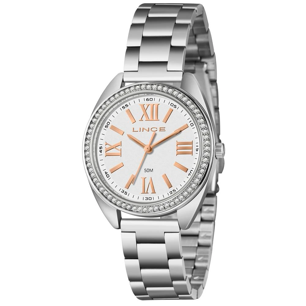 Caixa: MetalPulseira: AçoMedida da caixa: 36 mmVidro: Cristal MineralResistência à água: 50mFunções: AnalógicoMostrador Prateado com algarismos romanos e detalhes em roséAro externo de pedrasFundo de PressãoAlimentação do Maquinário: BateriaMaquinário JaponêsGarantia de 1 Ano