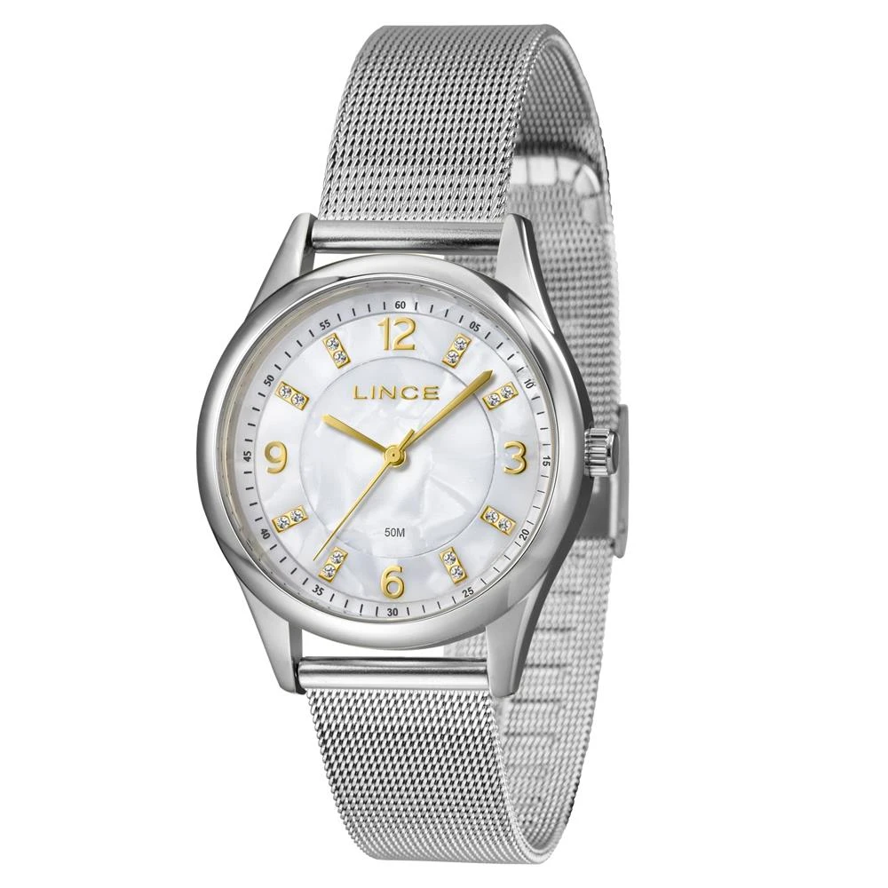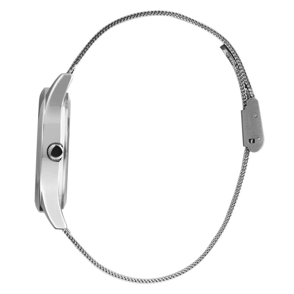 Caixa: MetalPulseira: Malha de Aço MeshMedida da caixa: 36 mmVidro: Cristal MineralResistência à água: 50mFunções: AnalógicoMostrador estilo madreperola branca com números e pedrasFundo de PressãoAlimentação do Maquinário: BateriaMaquinário JaponêsGarantia de 1 Ano
