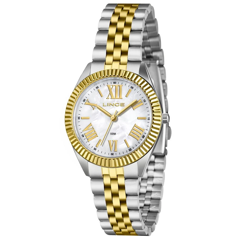 Caixa: MetalPulseira: AçoMedida da caixa: 36 mmVidro: Cristal MineralResistência à água: 50mFunções: AnalógicoMostrador Estilo madreperola branca com algarismos romanosFundo de PressãoAro Fixo CorrugadoAlimentação do Maquinário: BateriaMaquinário JaponêsPrateado com DouradoGarantia de 1 Ano