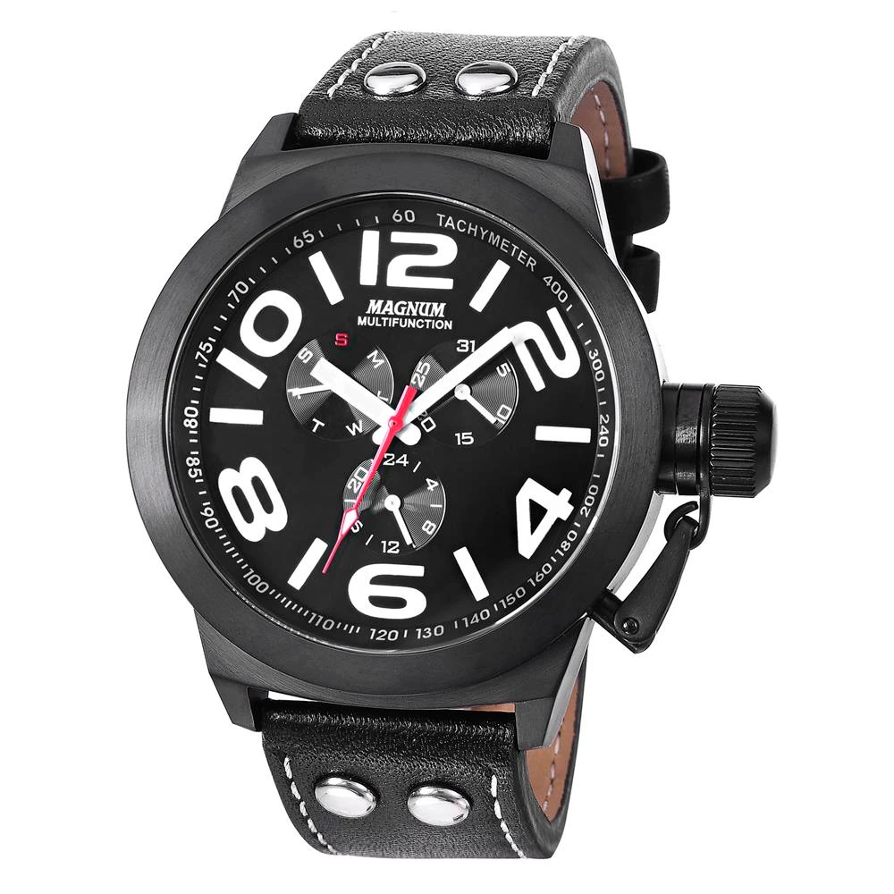 Caixa de Aço InoxidávelPulseira de Couro Legítimo PretaFundo RosqueadoVidro: Cristal MineralResistência à água: 10 AtmDiâmetro / Largura da Caixa: 48.00 MMFunções: Analógico, MultifunçãoAlimentação do Maquinário: BateriaMostrador Preto com números em brancoCoroa com Escotilha2 Anos de Garantia