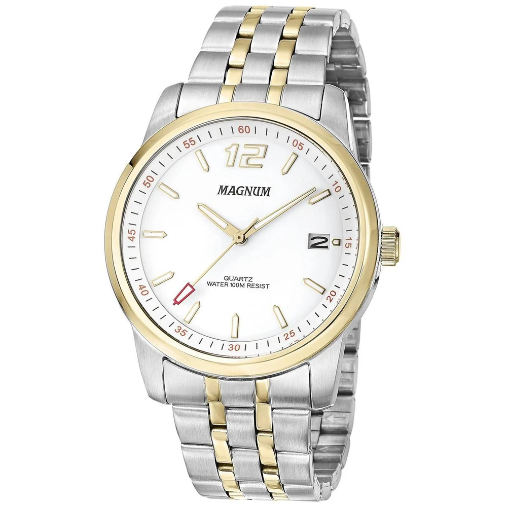 Caixa de Aço InoxidávelPulseira de Aço InoxidávelFundo RosqueadoVidro: Cristal MineralResistência à água: 10 AtmDiâmetro / Largura da Caixa: 43.00 MMFunções: Analógico, CalendárioAlimentação do Maquinário: BateriaMostrador Branco com número2 Anos de Garantia