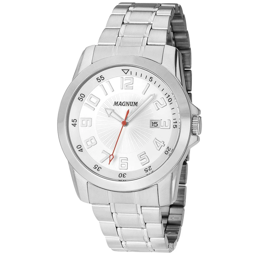 Caixa de Aço InoxidávelPulseira de Aço InoxidávelFundo RosqueadoVidro: Cristal MineralResistência à água: 10 AtmDiâmetro / Largura da Caixa: 42.00 MMFunções: Analógico, CalendárioAlimentação do Maquinário: BateriaMostrador Prateado com todos os números2 Anos de Garantia