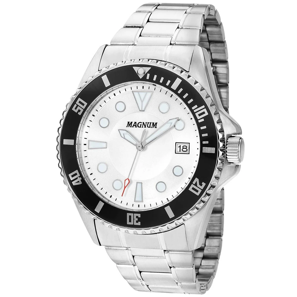Caixa de Aço InoxidávelPulseira de Aço InoxidávelFundo RosqueadoVidro: Cristal MineralResistência à água: 10 AtmDiâmetro / Largura da Caixa: 48.00 MMFunções: Analógico, CalendárioAlimentação do Maquinário: BateriaMostrador Branco