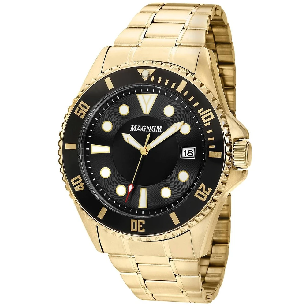 Caixa de Aço InoxidávelPulseira de Aço InoxidávelFundo RosqueadoVidro: Cristal MineralResistência à água: 10 AtmDiâmetro / Largura da Caixa: 48.00 MMFunções: Analógico, CalendárioAlimentação do Maquinário: BateriaMostrador Preto2 Anos de Garantia