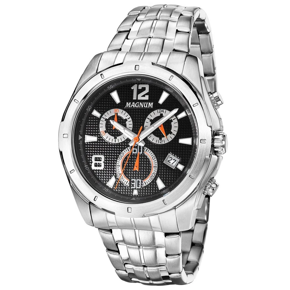 Caixa de Aço InoxidávelPulseira de Aço InoxidávelFundo RosqueadoVidro: Cristal MineralResistência à água: 10 AtmDiâmetro / Largura da Caixa: 46.00 MMFunções: Analógico, Cronógrafo, CalendárioAlimentação do Maquinário: BateriaMostrador PretoEstilo Esporte Fino2 Anos de Garantia