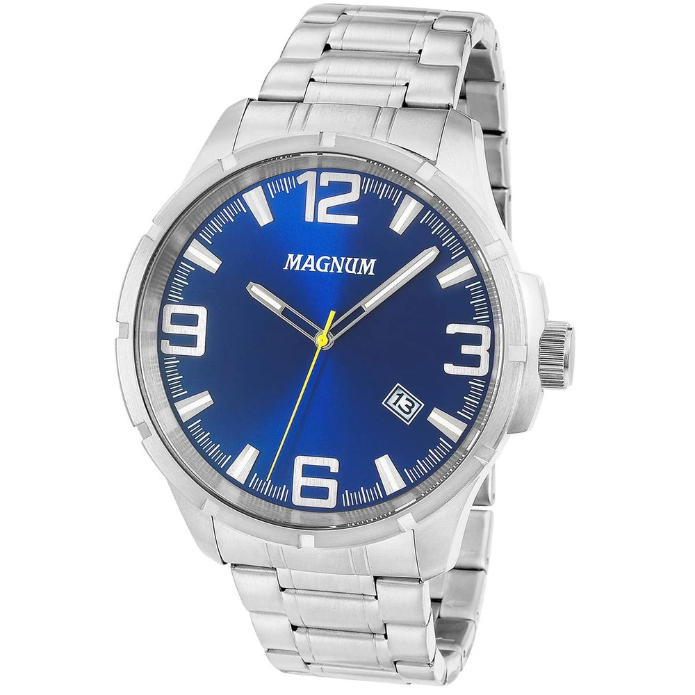 Caixa de Aço InoxidávelPulseira de Aço InoxidávelFundo RosqueadoVidro: Cristal MineralResistência à água: 10 AtmDiâmetro / Largura da Caixa: 49.00 MMFunções: Analógico, CalendárioAlimentação do Maquinário: BateriaMostrador Azul com números2 Anos de Garantia