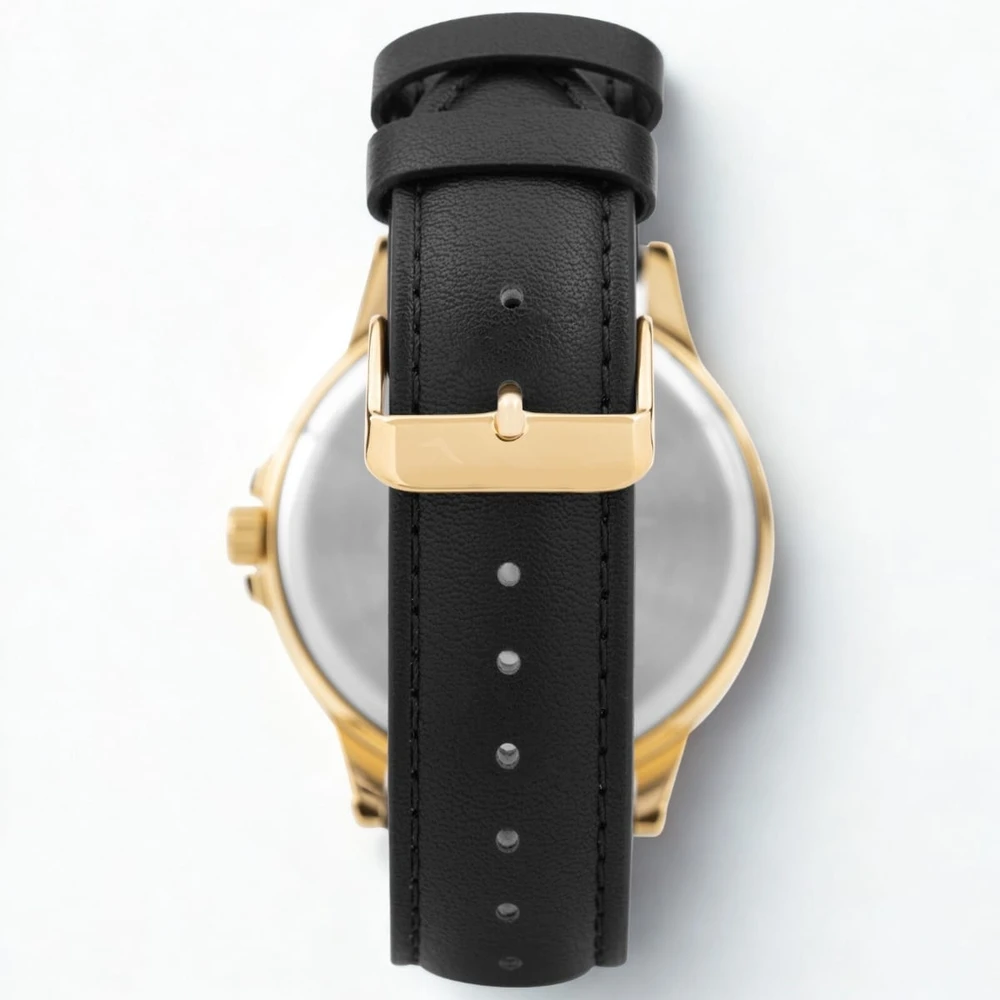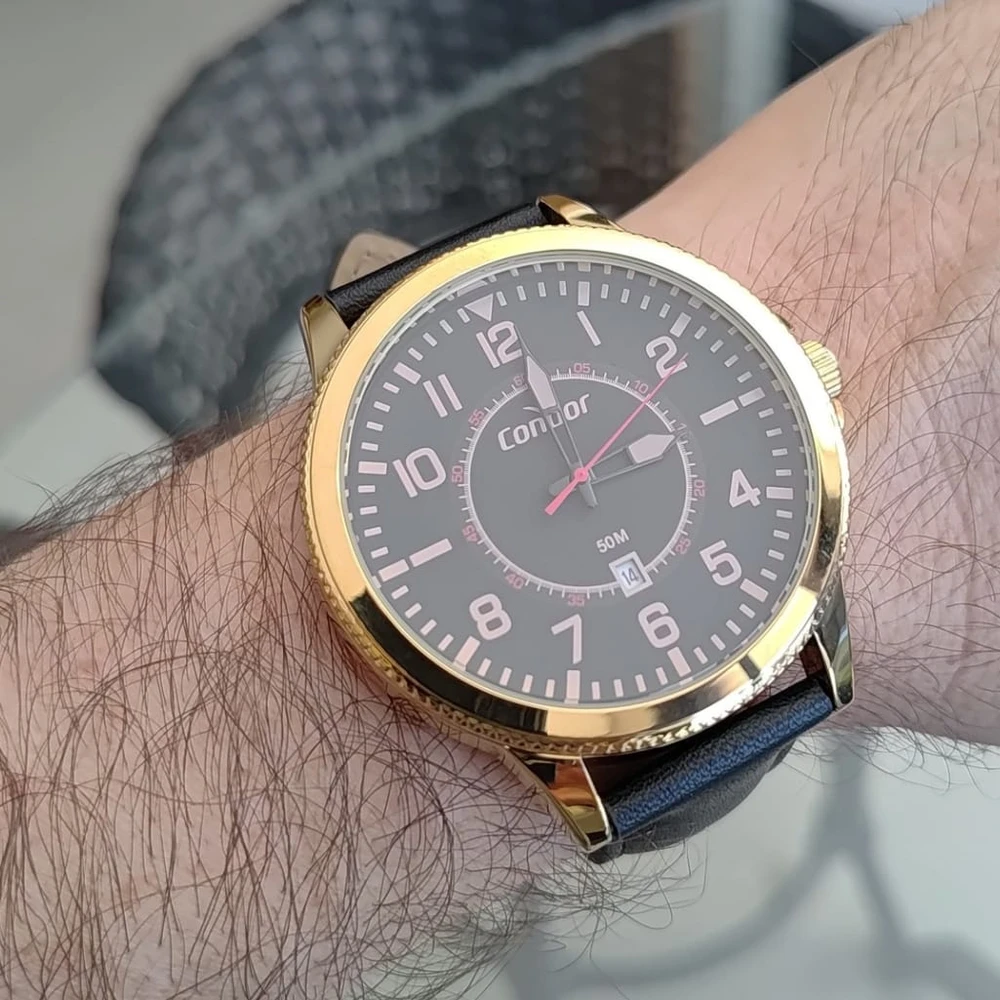 O relógio que todo homem quer está na coleção Militar da Condor. Pulseira de couro sintético preto e banho dourado. Mostrador em estilo militar preto. Relógio com detalhe de cor no segundeiro.