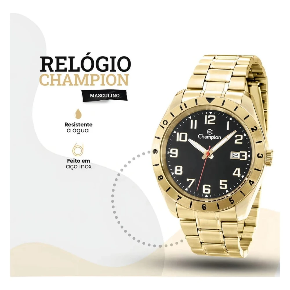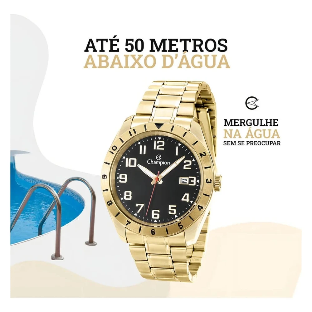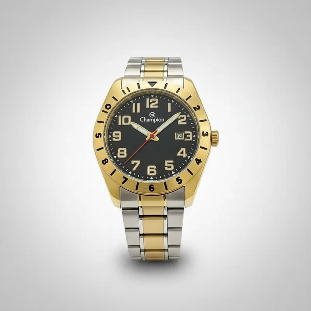 Relógio masculino CA31435U dourado Champion: sofisticação e resistência para o seu dia a dia. Com design clássico em aço inoxidável dourado e mostrador preto com números claros, oferece leitura rápida e estilo marcante. Ideal para homens que valorizam elegância e funcionalidade, é resistente à água até 50 metros, permitindo mergulhos sem preocupações. O mecanismo analógico preciso garante pontualidade, e a pulseira ajustável proporciona conforto ao usar. Perfeito para ocasiões formais ou momentos de lazer, este relógio Champion une durabilidade e visual moderno, elevando sua presença em qualquer situação.