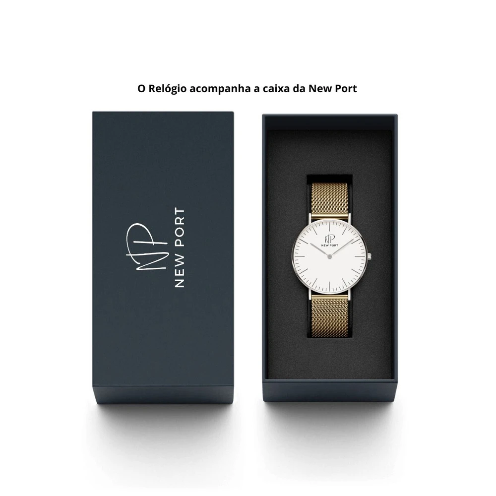 O Relógio Masculino de Pulso Bonaparte Casual, com sua pulseira em metal dourada, apresenta um generoso diâmetro de 40mm. A caixa é construída em metal prateado, abrigando um mostrador branco protegido por um vidro de mineral com alta resistência.