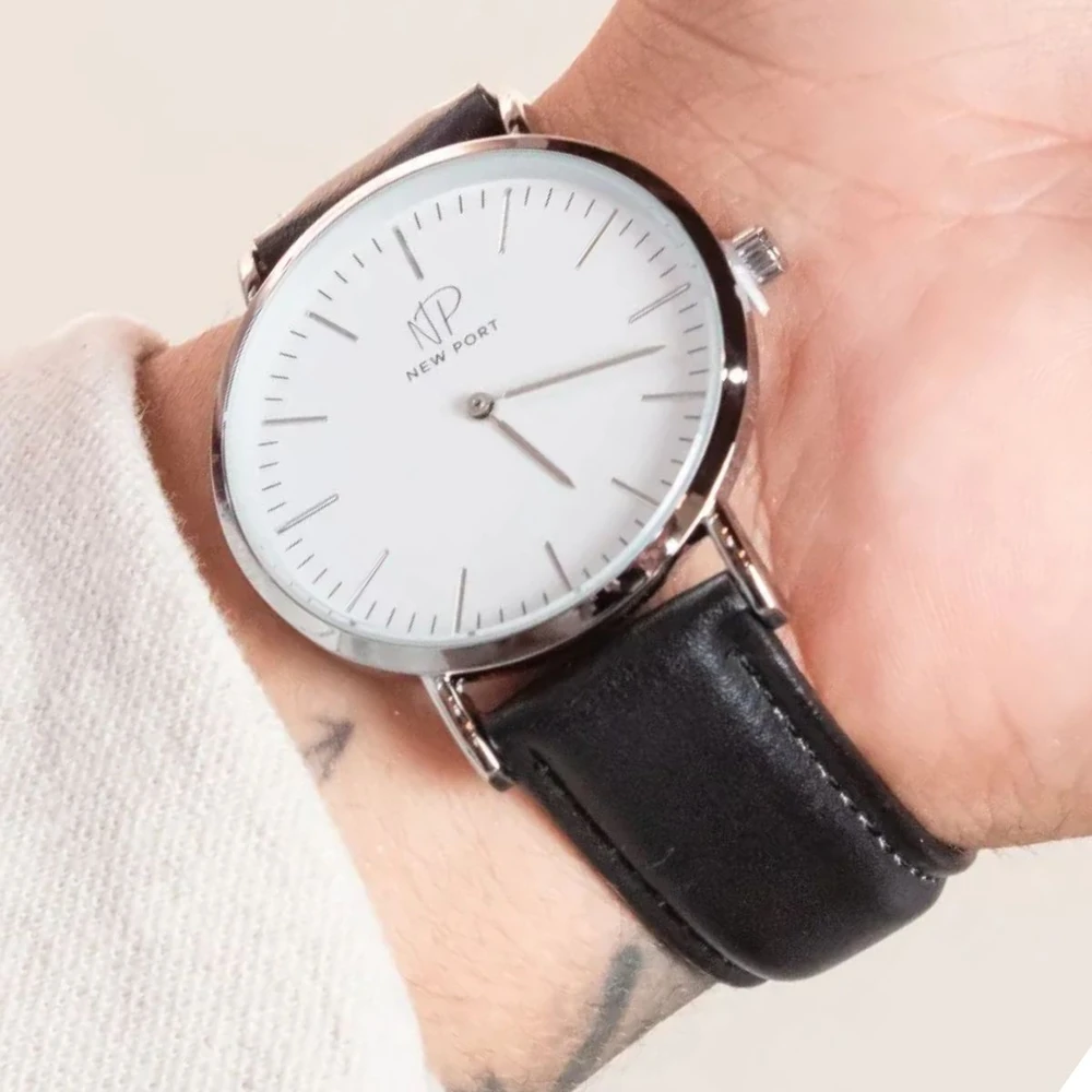 Relógio Masculino New Port Preto Pulseira De Couro Vegano Riverside Minimalista 40mm de diâmetro. A caixa é de metal prateada e o mostrador branco, vidro com mineral endurecido com alta resistência.
