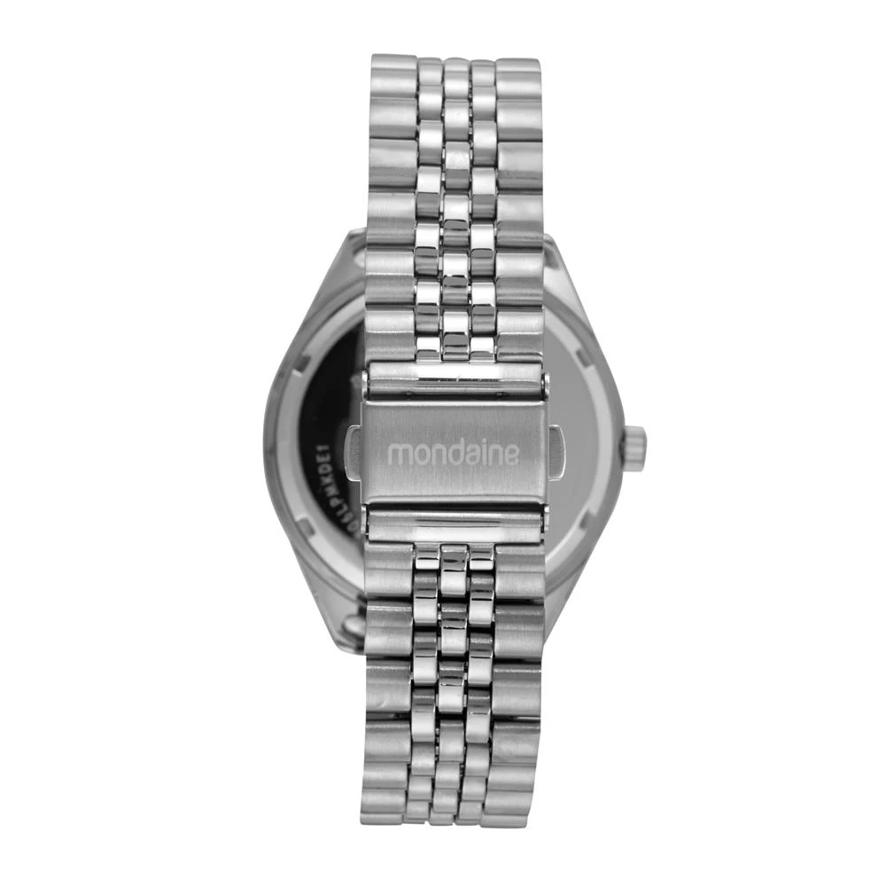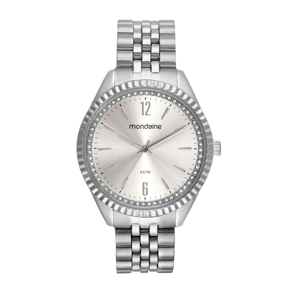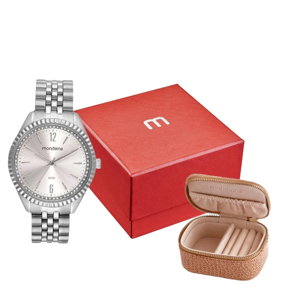 Caixa de MetalPulseira de AçoVidro de Cristal MineralFundo RosqueadoResistente à Água 5 AtmDiâmetro / Largura da Caixa: 40.00 MMFunção: AnalógicoAlimentação do Maquinário: BateriaMostrador Rosa Claro com Números e Pedras+ Porta JoiasGarantia de 1 Ano