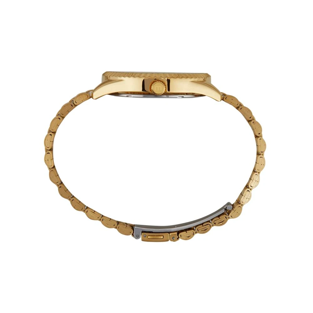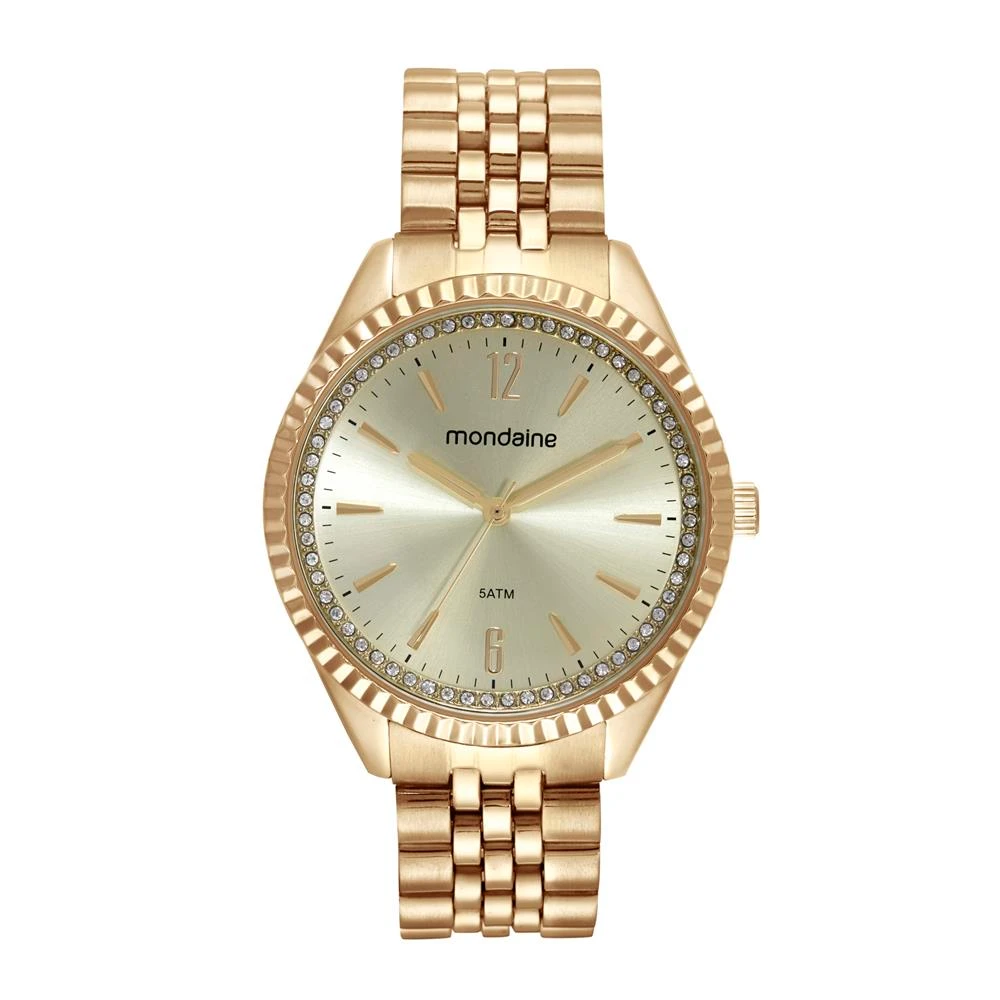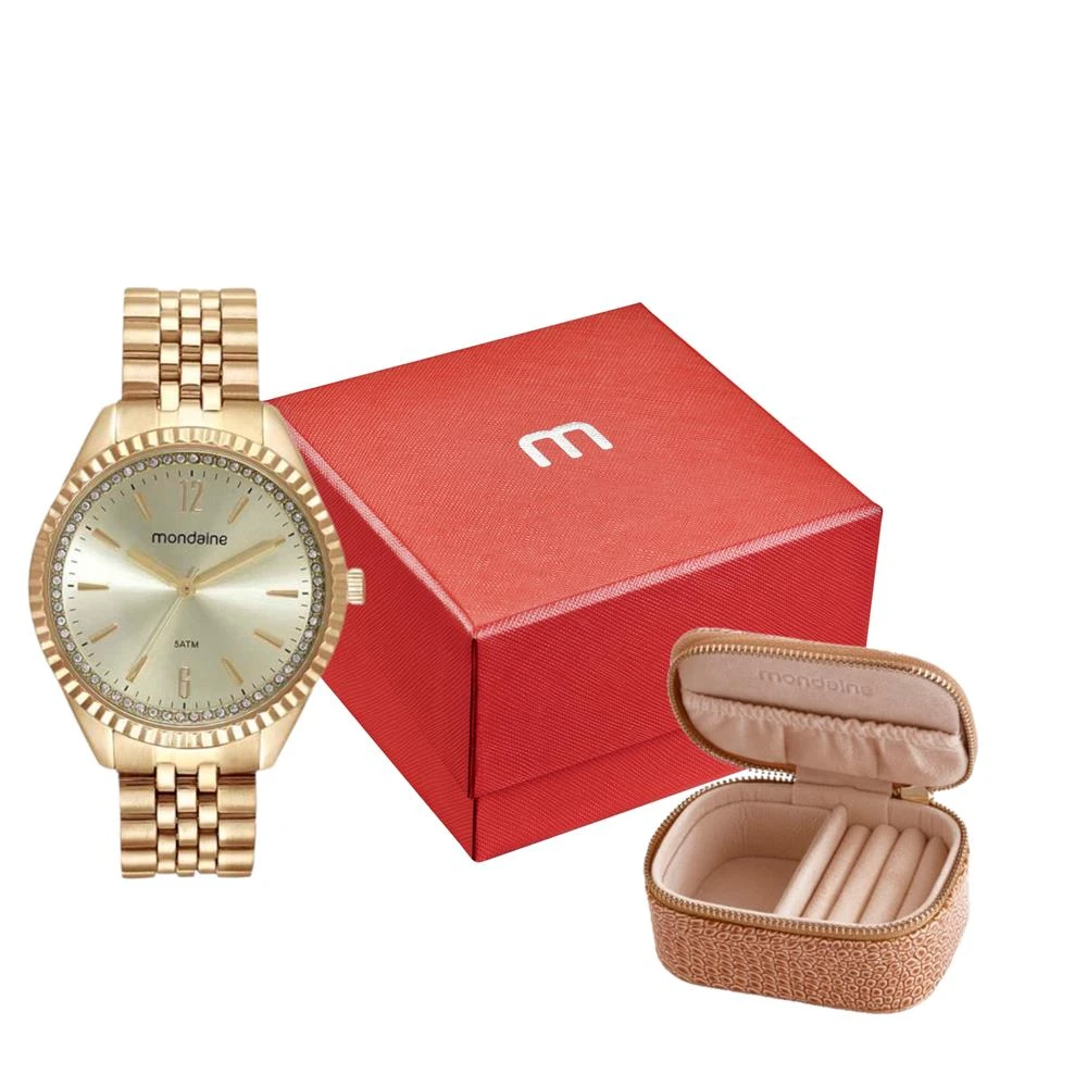 Caixa de MetalPulseira de AçoVidro de Cristal MineralFundo RosqueadoResistente à Água 5 AtmDiâmetro / Largura da Caixa: 40.00 MMFunção: AnalógicoAlimentação do Maquinário: BateriaMostrador Dourado com Números e Pedras+ Porta JoiasGarantia de 1 Ano