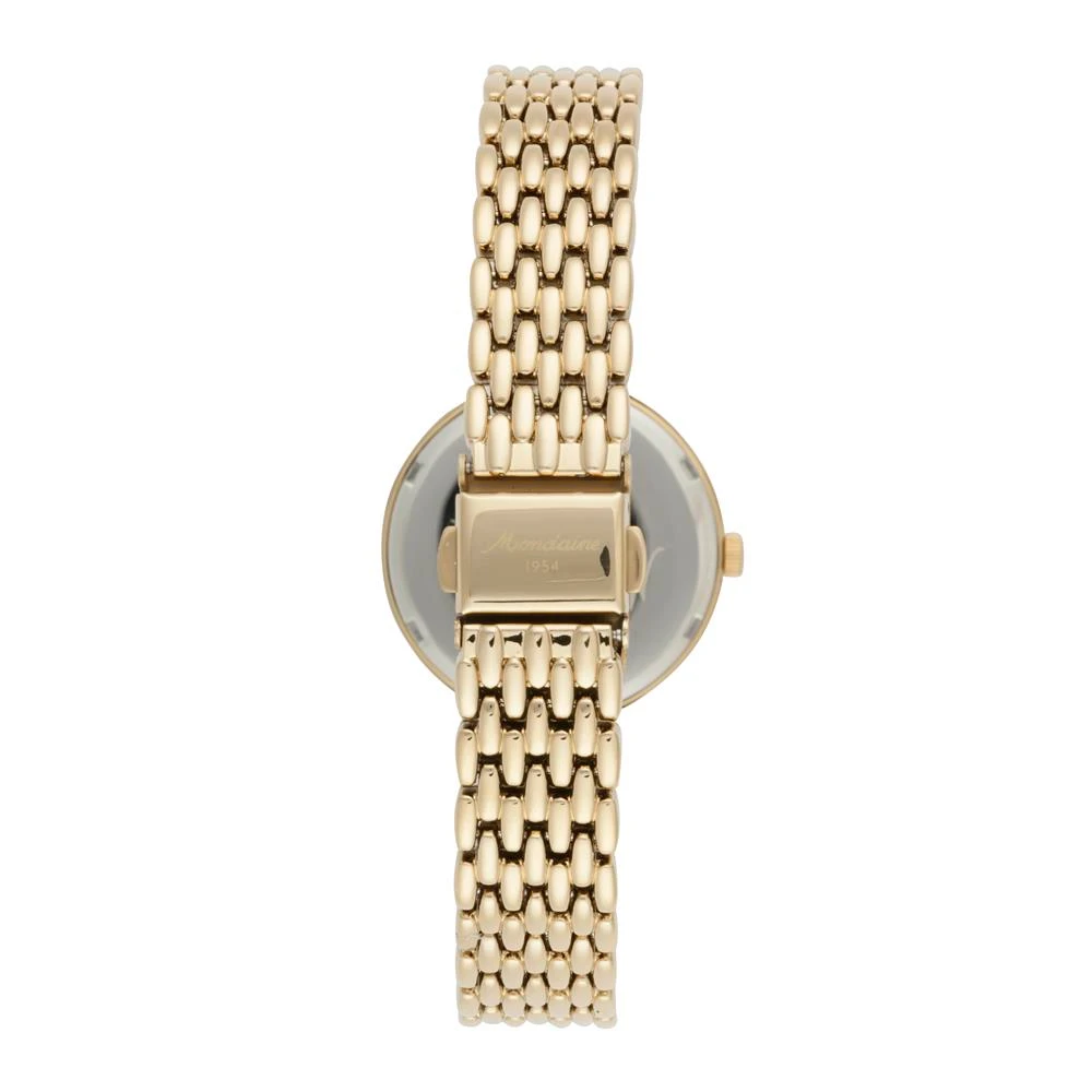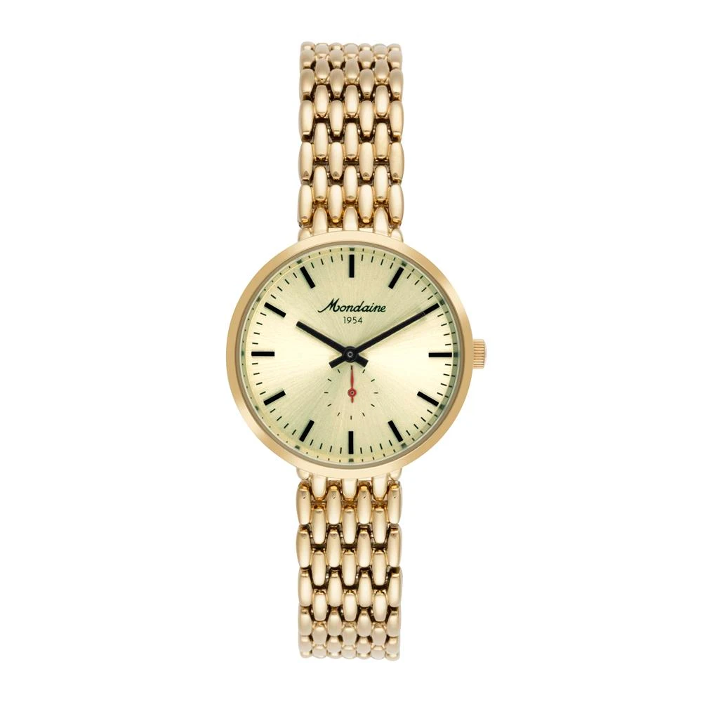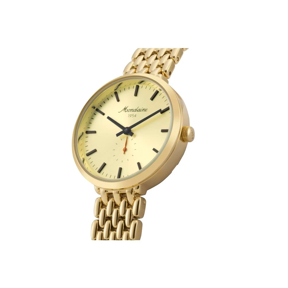 Caixa de MetalPulseira de MetalVidro de Cristal MineralFundo RosqueadoResistente à Água 5 AtmDiâmetro / Largura da Caixa: 32.00 MMAltura da Caixa: 9.00 MMFunção: Analógico, Segundeiro deslocadoAlimentação do Maquinário: BateriaMostrador Dourado e inscrição Mondaine 1954Coleção Especial Mondaine 1954