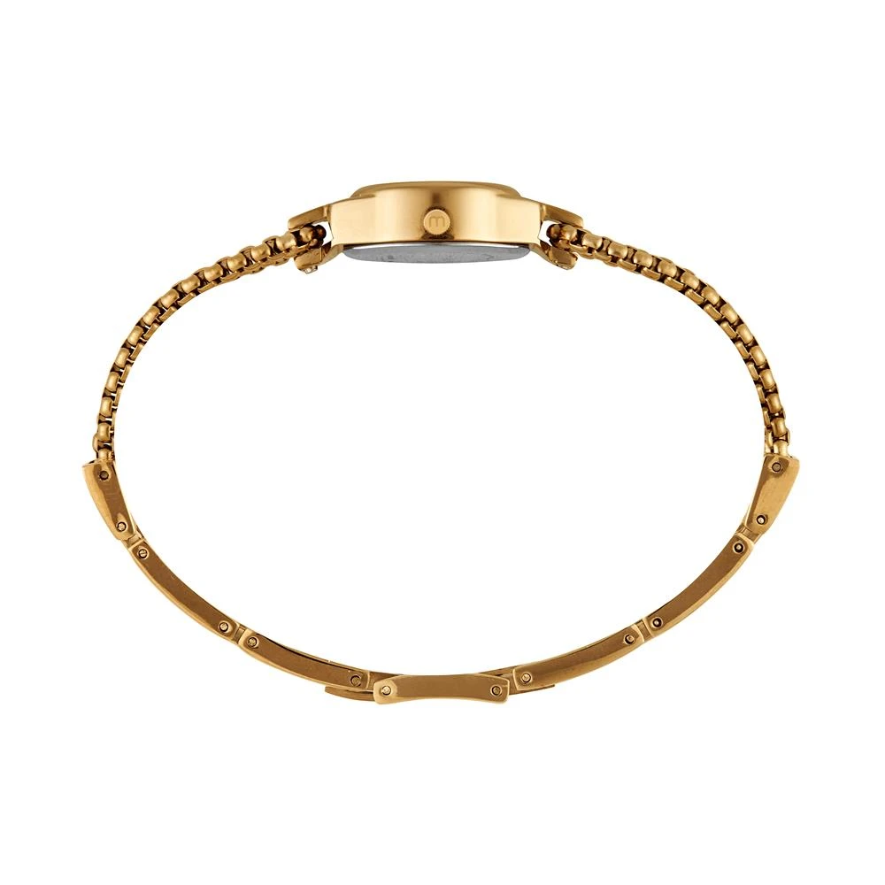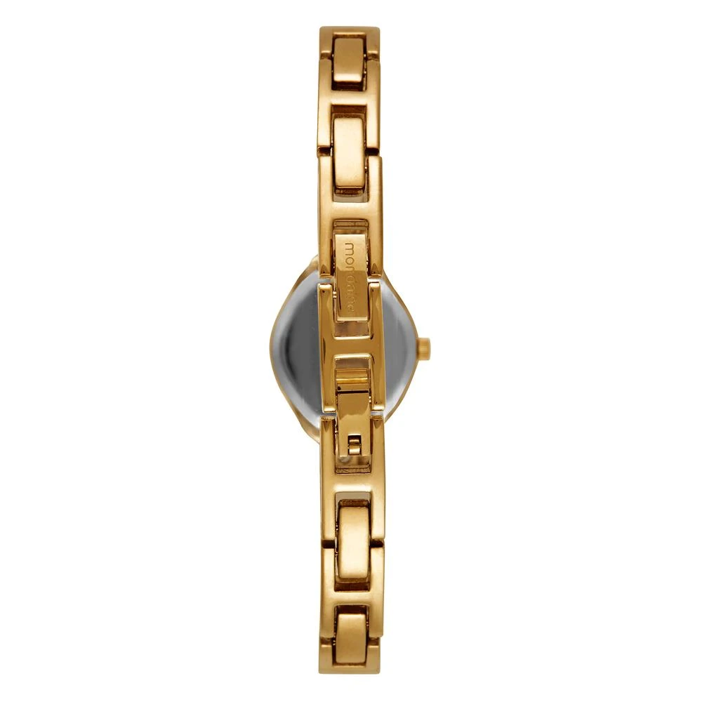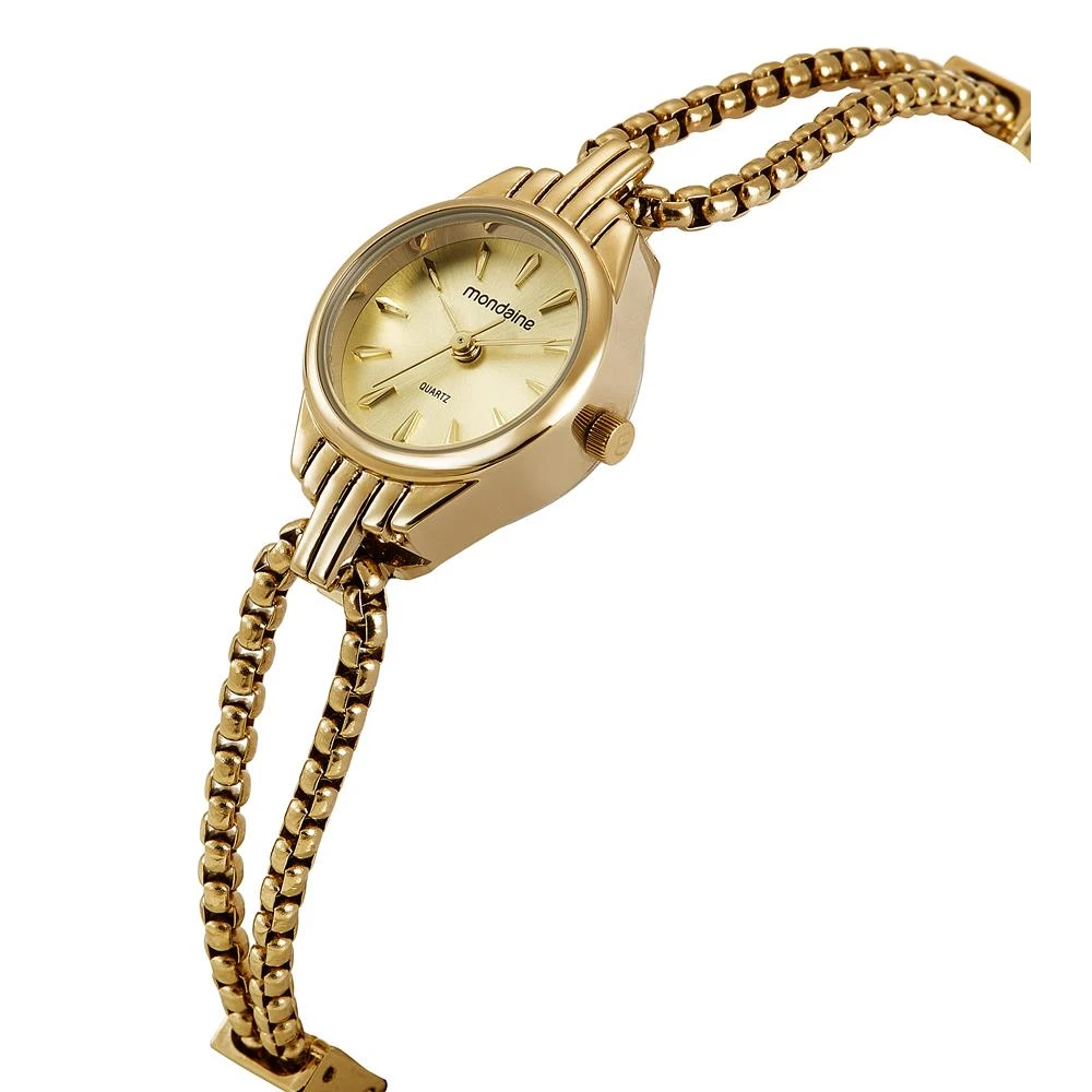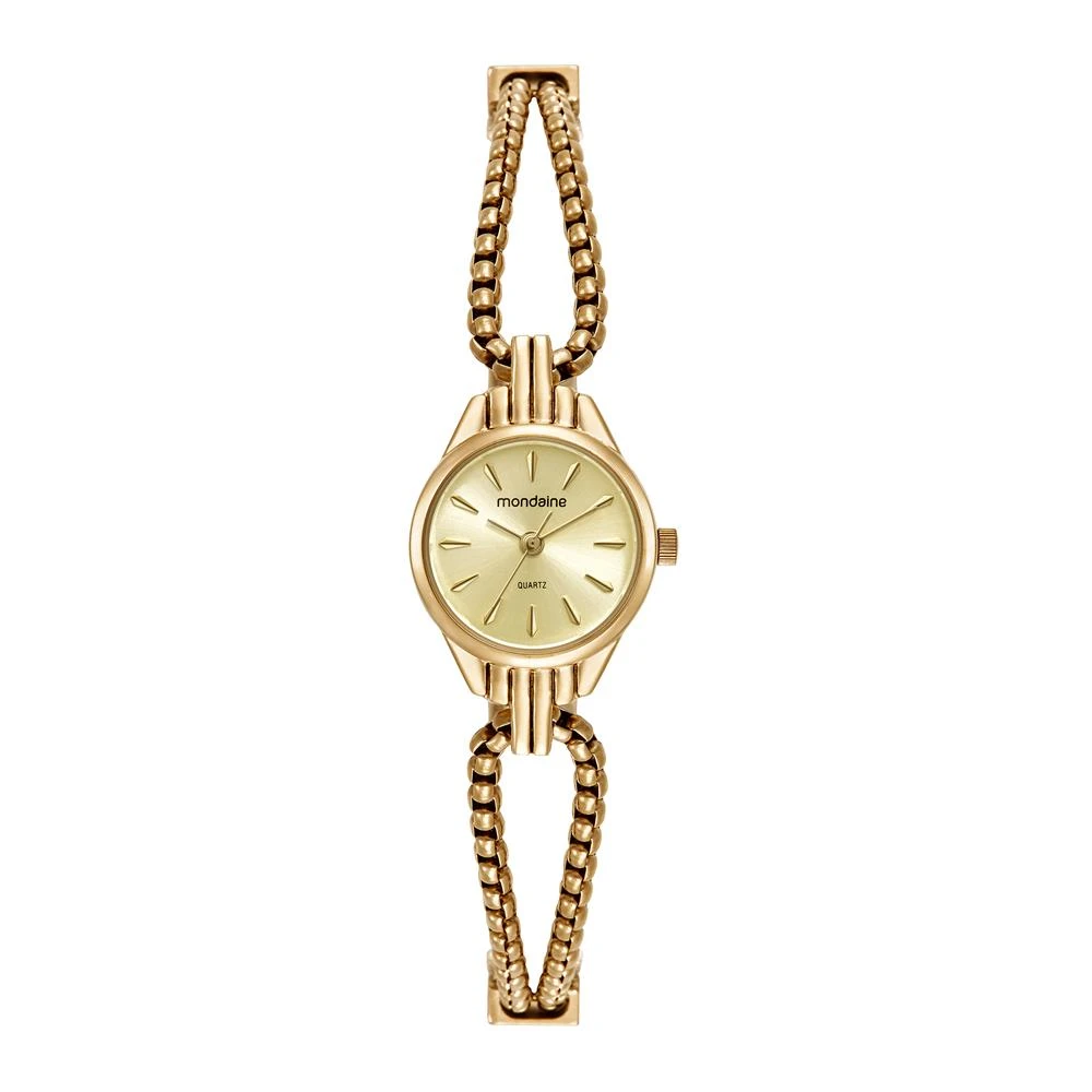 Caixa de MetalPulseira de Aço Estilo BraceleteVidro de Cristal MineralFundo de PressãoResistente à Água 3 AtmDiâmetro / Largura da Caixa: 20.00 MMFunção: AnalógicoAlimentação do Maquinário: BateriaMostrador DouradoGarantia de 1 Ano