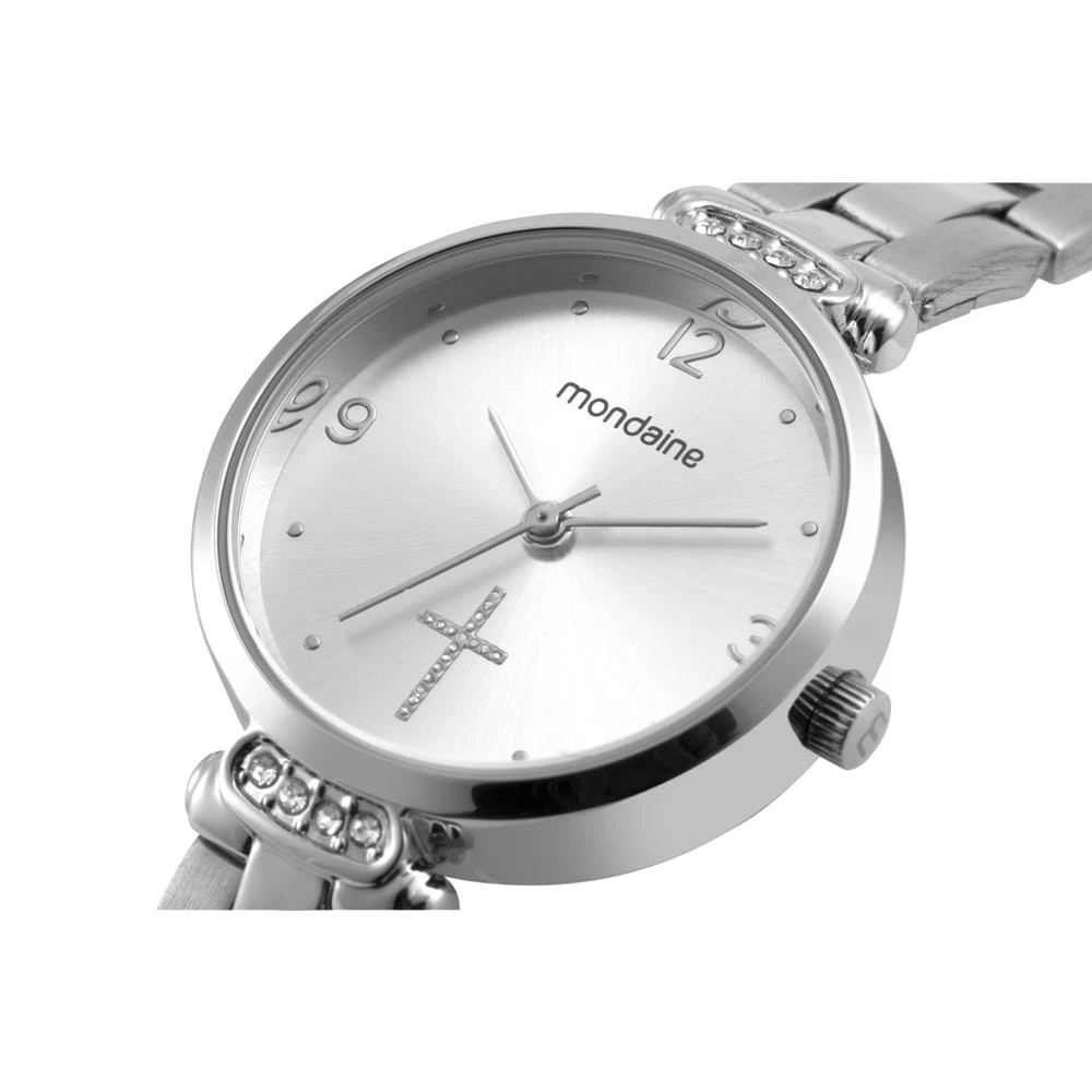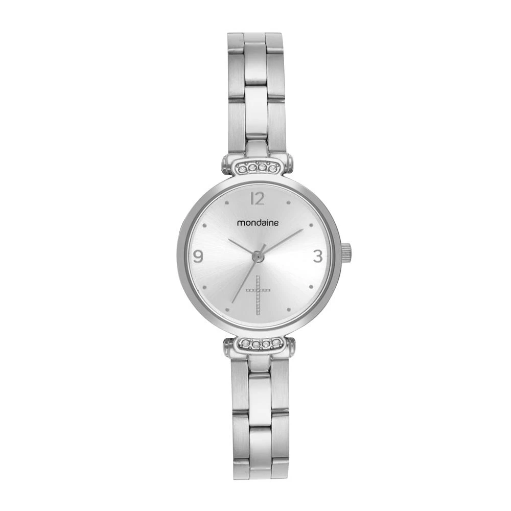 Caixa de MetalPulseira de AçoVidro de Cristal MineralFundo RosqueadoResistente à Água 5 AtmDiâmetro / Largura da Caixa: 28.00 MMFunção: AnalógicoAlimentação do Maquinário: BateriaMostrador Prateado com Números e Cruz+ Corrente e Pingente (Cruz) SemijoiaTema: ReligiosoGarantia de 1 Ano