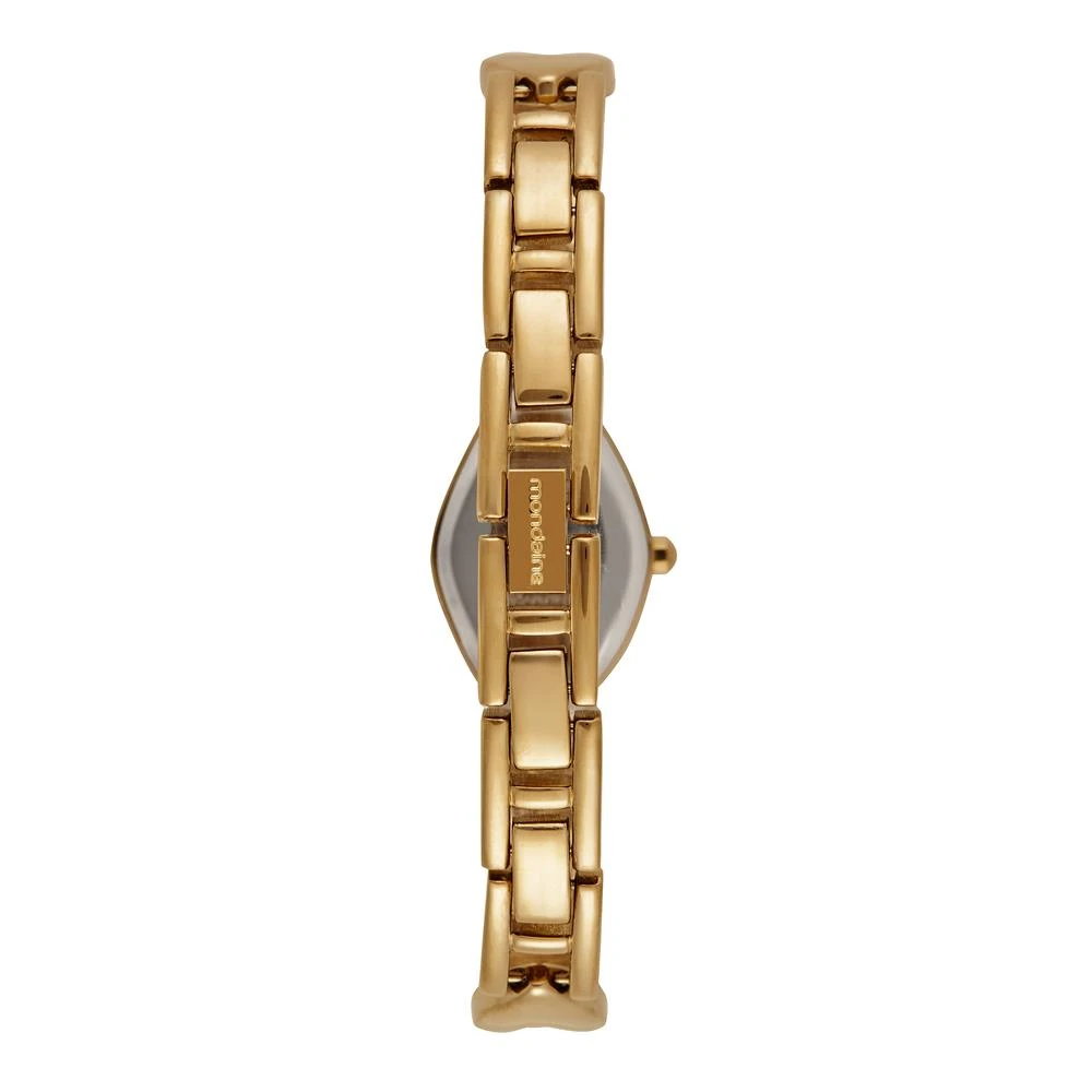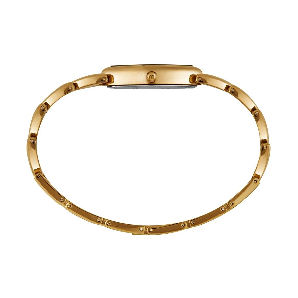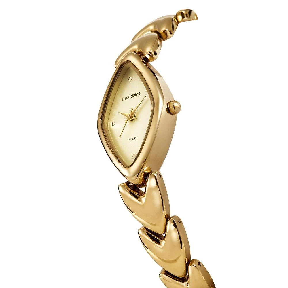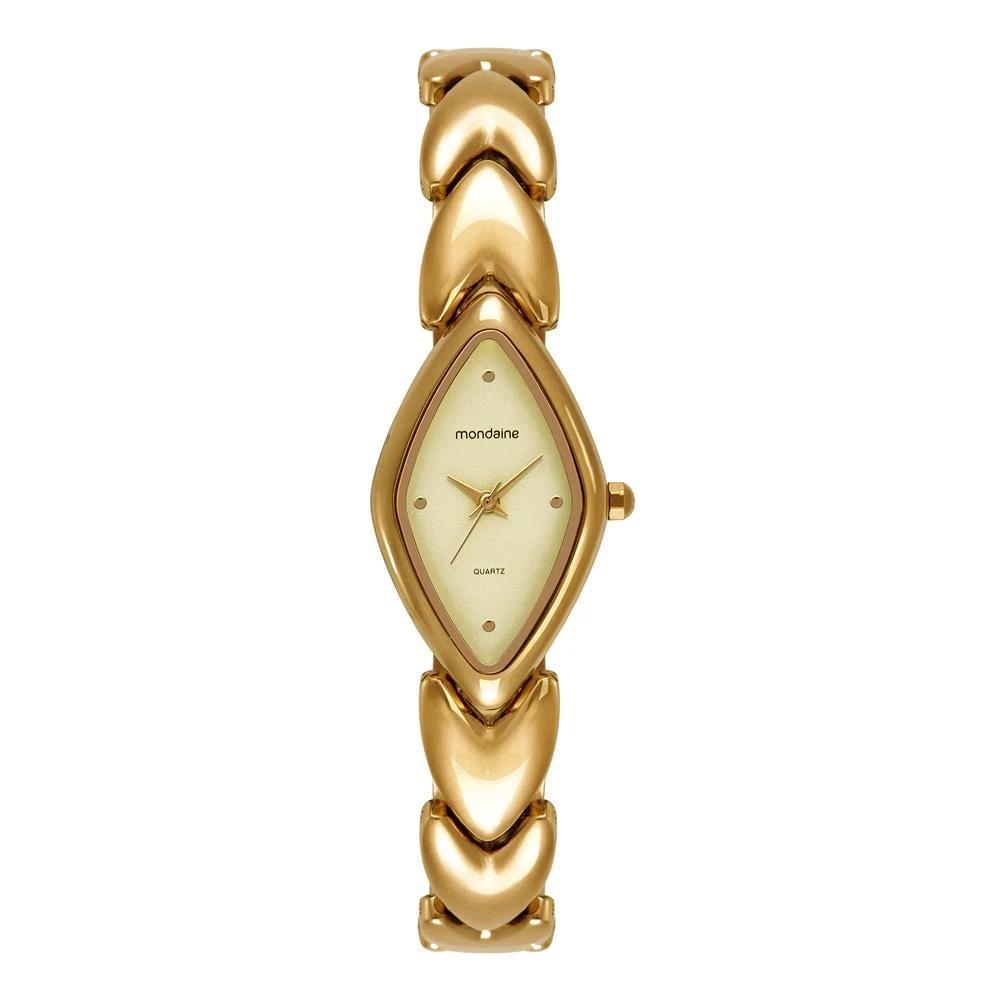 Caixa de MetalPulseira de Metal Estilo BraceleteVidro de Cristal MineralFundo de PressãoResistente à Água 3 AtmDiâmetro / Largura da Caixa: 20.00 MM x 36.00 MMFunção: Analógico, BraceleteAlimentação do Maquinário: BateriaMostrador DouradoGarantia de 1 Ano