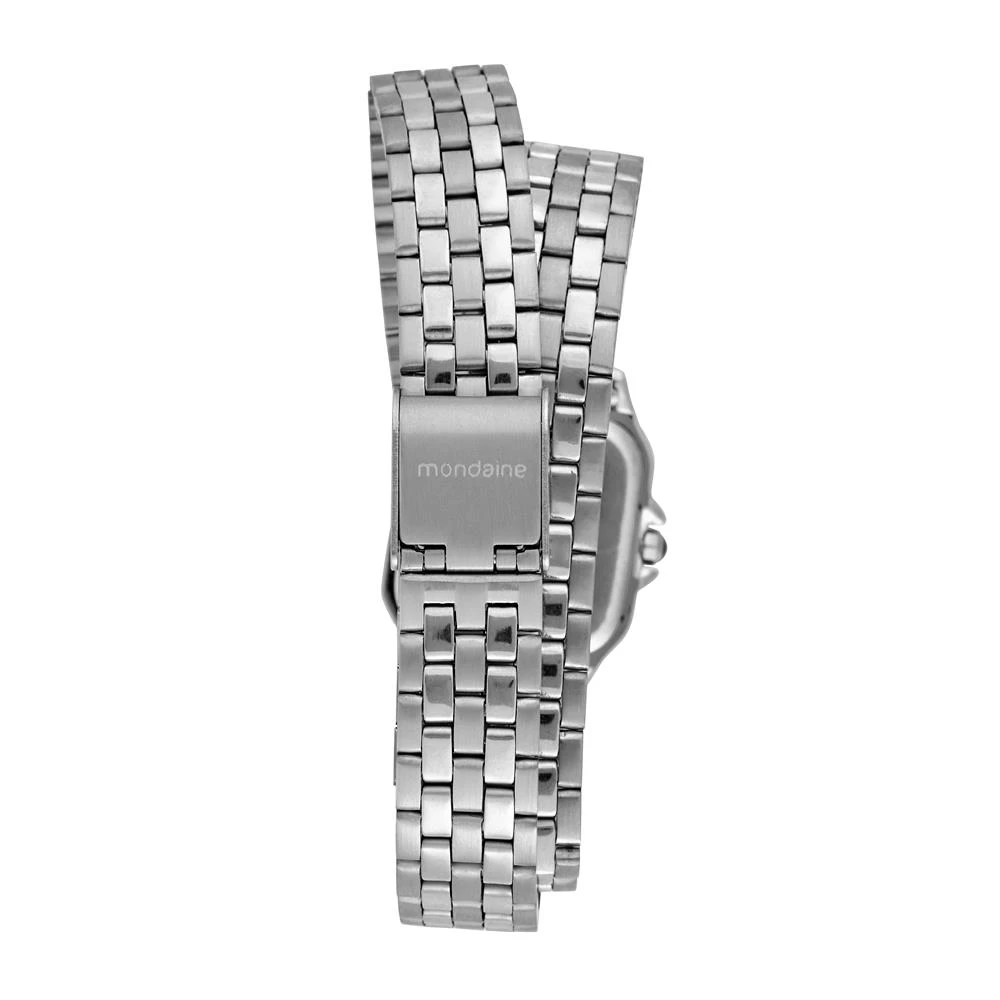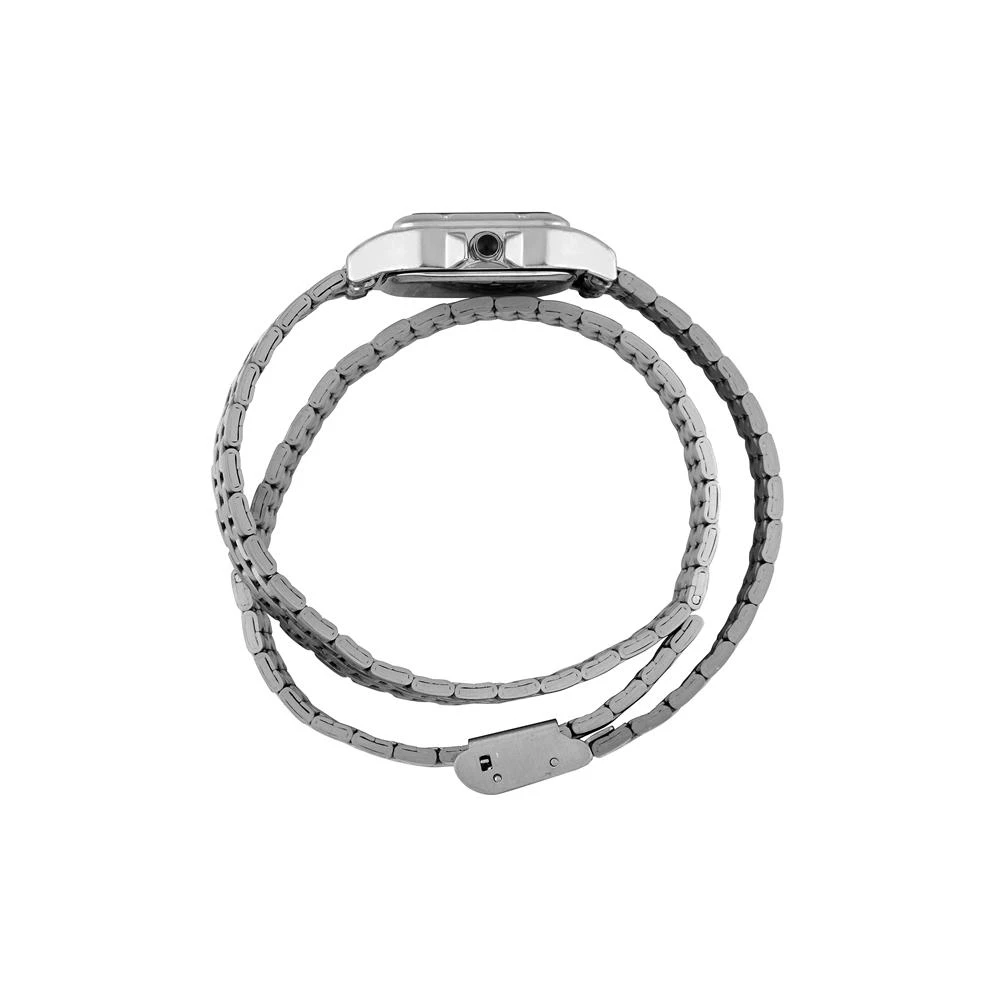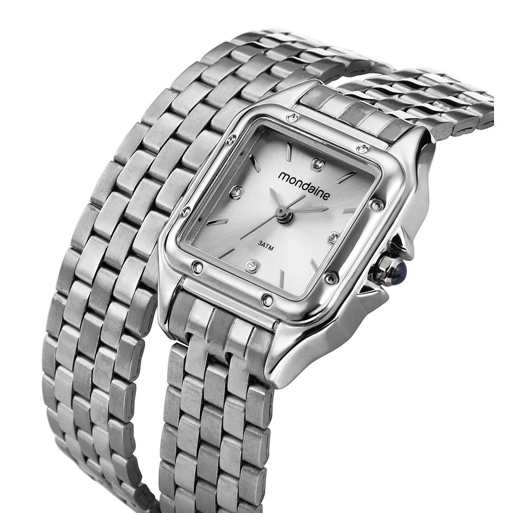 Caixa de MetalPulseira de Aço Longa (Para dar 2 voltas no pulso)Vidro de Cristal MineralFundo de PressãoResistente à Água 3 AtmDiâmetro / Largura da Caixa: 23.00 MM x 23.00 MMFunção: AnalógicoAlimentação do Maquinário: BateriaMostrador Prateado com pedrasGarantia de 1 Ano