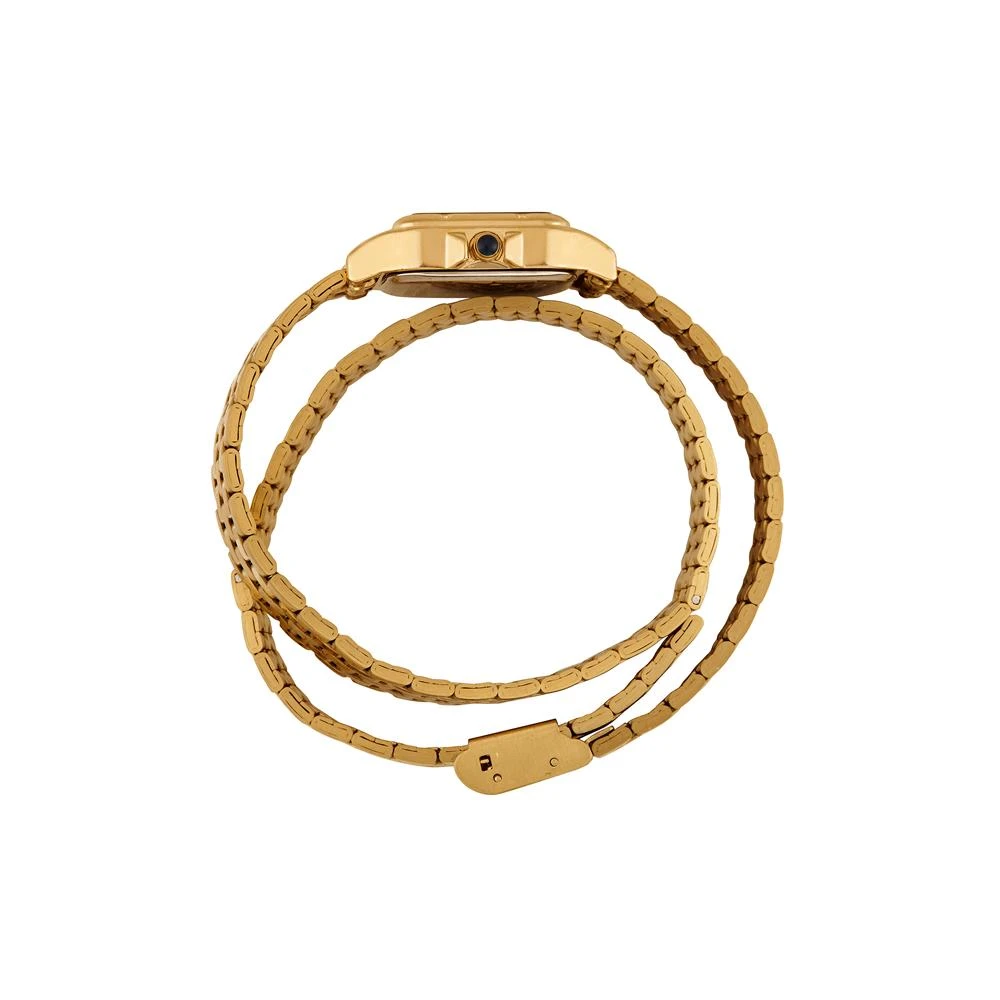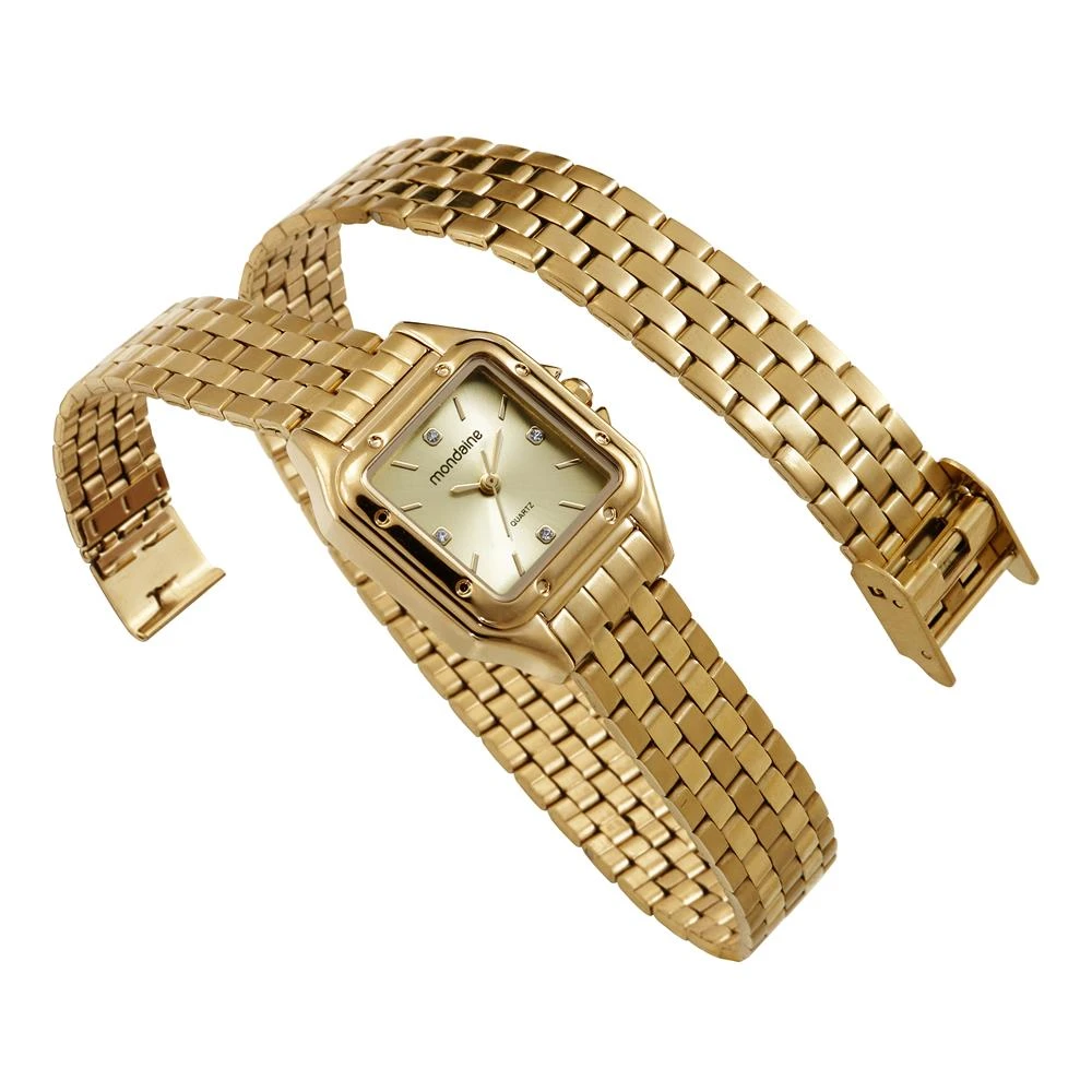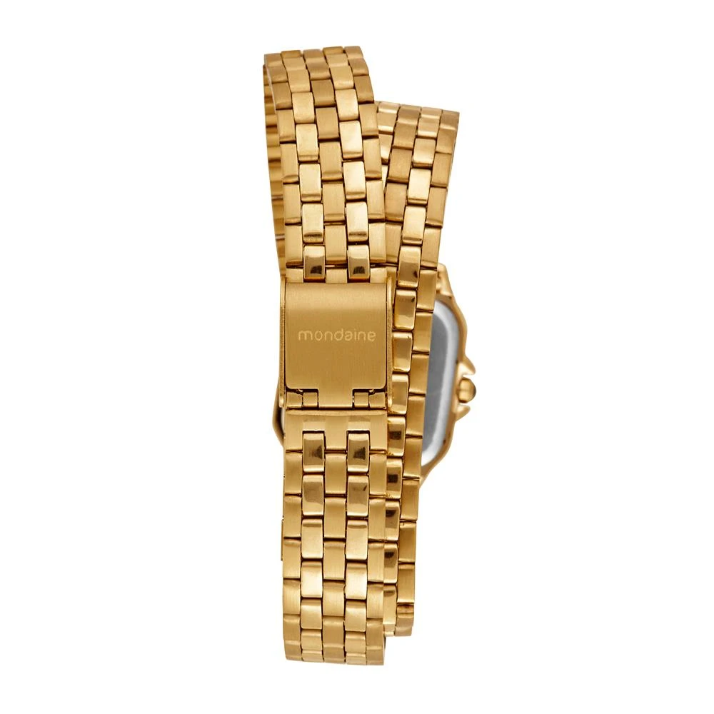 Caixa de MetalPulseira de Aço Longa (Para dar 2 voltas no pulso)Vidro de Cristal MineralFundo de PressãoResistente à Água 3 AtmDiâmetro / Largura da Caixa: 23.00 MM x 23.00 MMFunção: AnalógicoAlimentação do Maquinário: BateriaMostrador Dourado com pedrasGarantia de 1 Ano