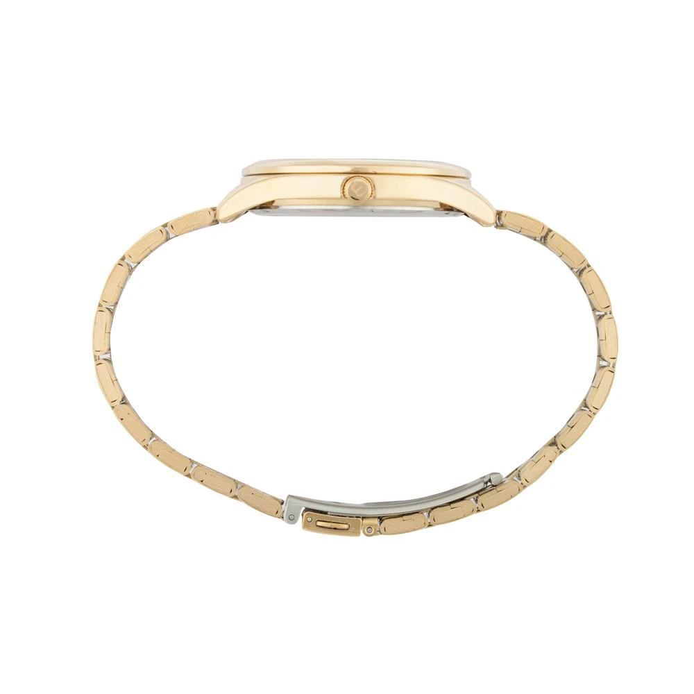 Caixa de MetalPulseira de AçoVidro de Cristal MineralFundo RosqueadoResistente à Água 5 AtmDiâmetro / Largura da Caixa: 40.00 MMFunção: AnalógicoAlimentação do Maquinário: BateriaMostrador dourado com brilhoGarantia de 1 Ano