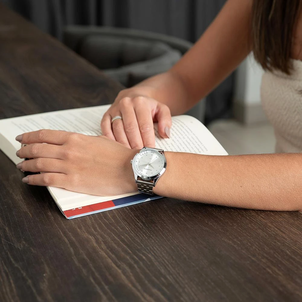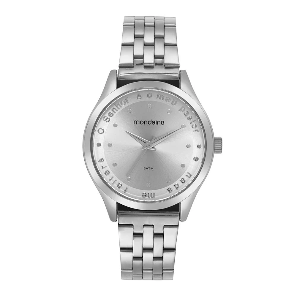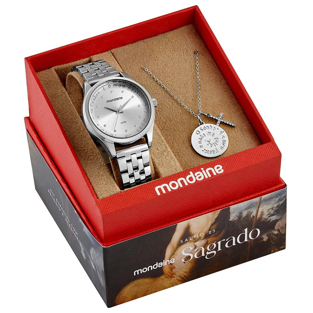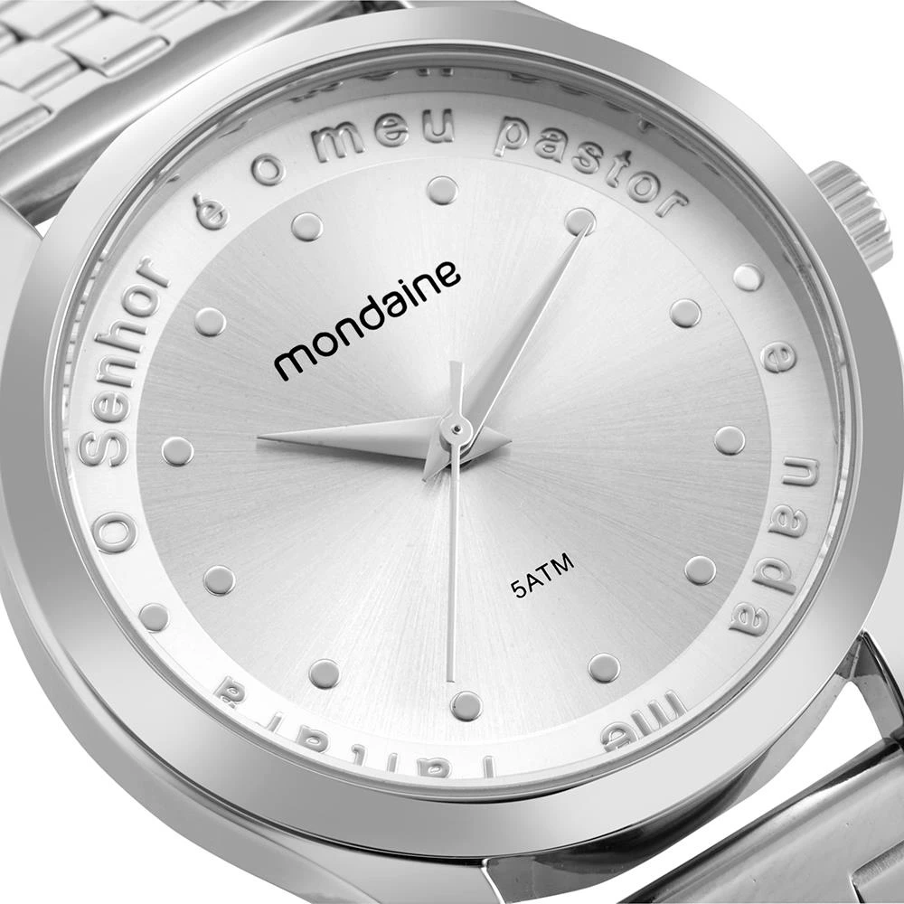 Caixa de MetalPulseira de AçoVidro de Cristal MineralFundo RosqueadoResistente à Água 5 AtmDiâmetro / Largura da Caixa: 38.00 MMFunção: AnalógicoAlimentação do Maquinário: BateriaMostrador Prateado com trecho do Salmo 23 (O Senhor é meu pastor e nada me faltará)+ Corrente e Pingentes (crucifixo e medalha com treco do Salmo 23) SemijoiaTema: Religioso - CristãoGarantia de 1 Ano
