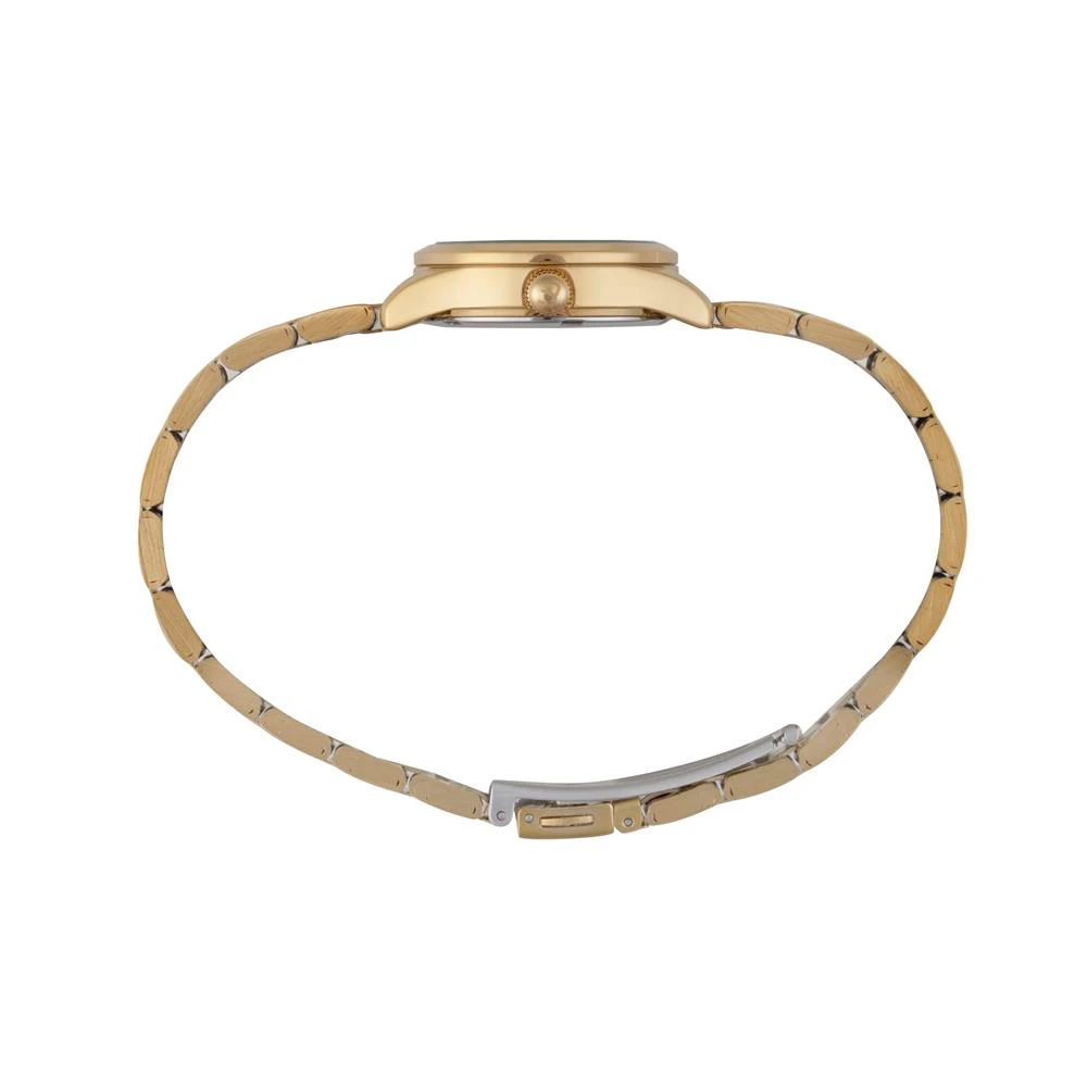 Caixa de MetalPulseira de AçoVidro de Cristal MineralFundo RosqueadoResistente à Água 5 AtmDiâmetro / Largura da Caixa: 28.00 MMFunção: AnalógicoAlimentação do Maquinário: BateriaMostrador dourado com númerosGarantia de 1 Ano