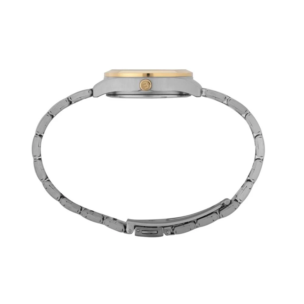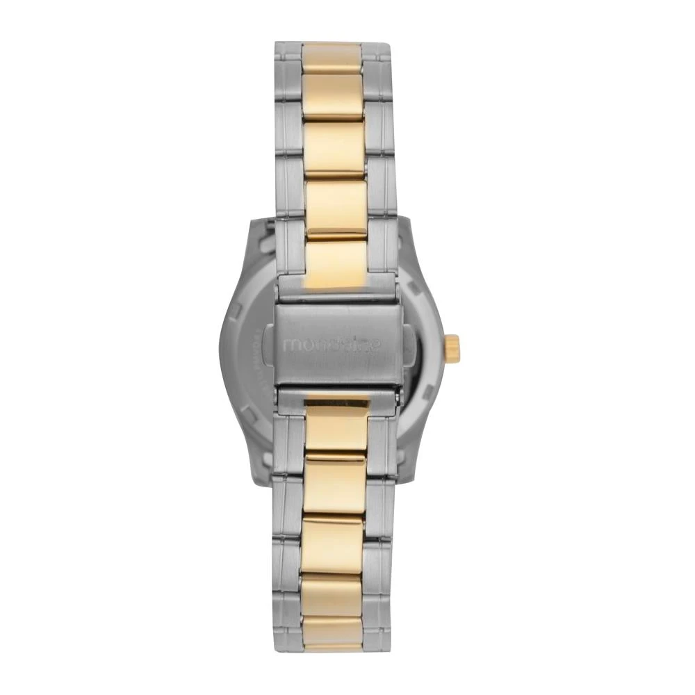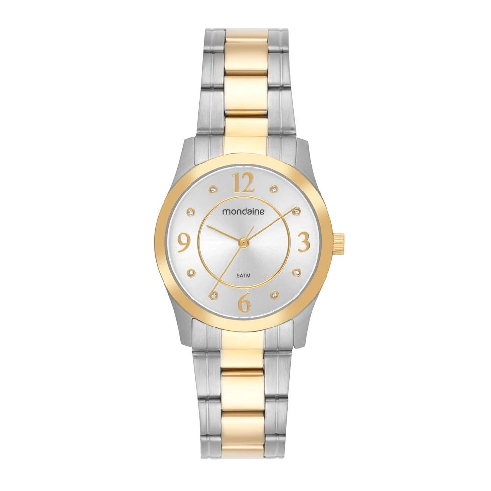 Caixa de AçoPulseira de AçoVidro de Cristal MineralFundo RosqueadoResistente à Água 5 AtmDiâmetro / Largura da Caixa: 32.00 MMFunção: AnalógicoAlimentação do Maquinário: BateriaMostrador Prateado com Números e pedrasPrateado com DouradoGarantia de 1 Ano