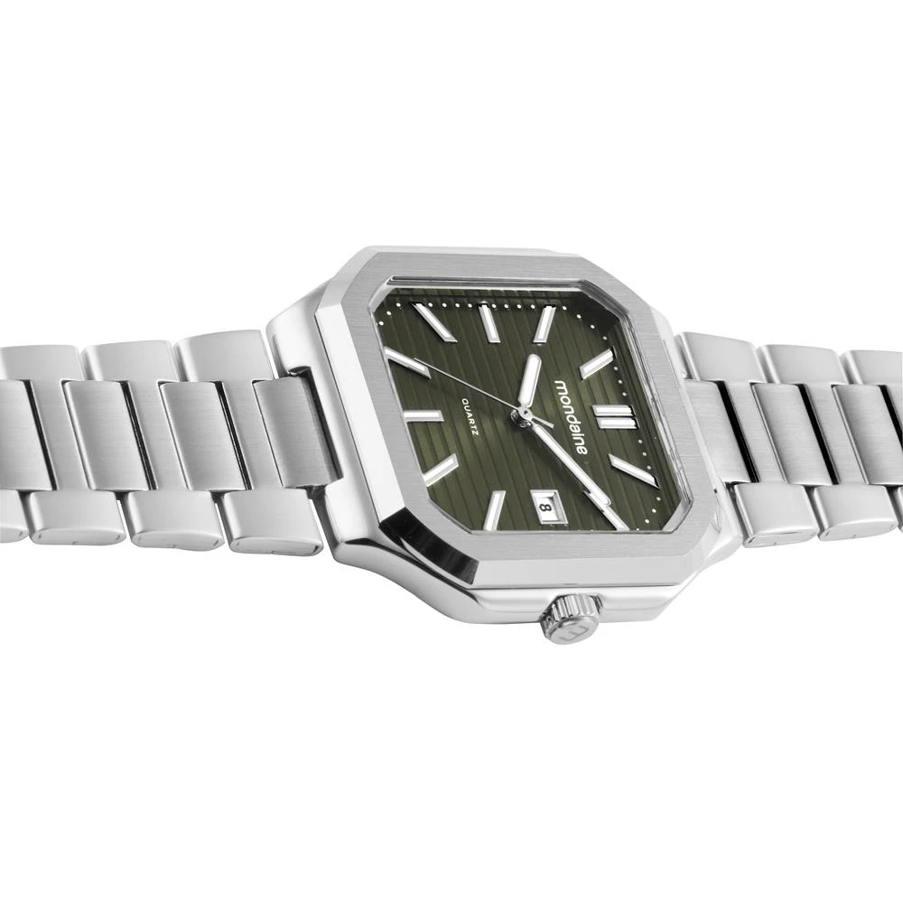 Caixa de MetalPulseira de AçoVidro de Cristal MineralFundo de PressãoResistente à Água 3 AtmDiâmetro / Largura da Caixa: 40.00 MM x 38.00 MMFunção: Analógico, CalendárioMostrador Verde MusgoAlimentação do Maquinário: BateriaGarantia de 1 Ano