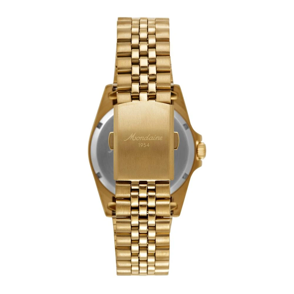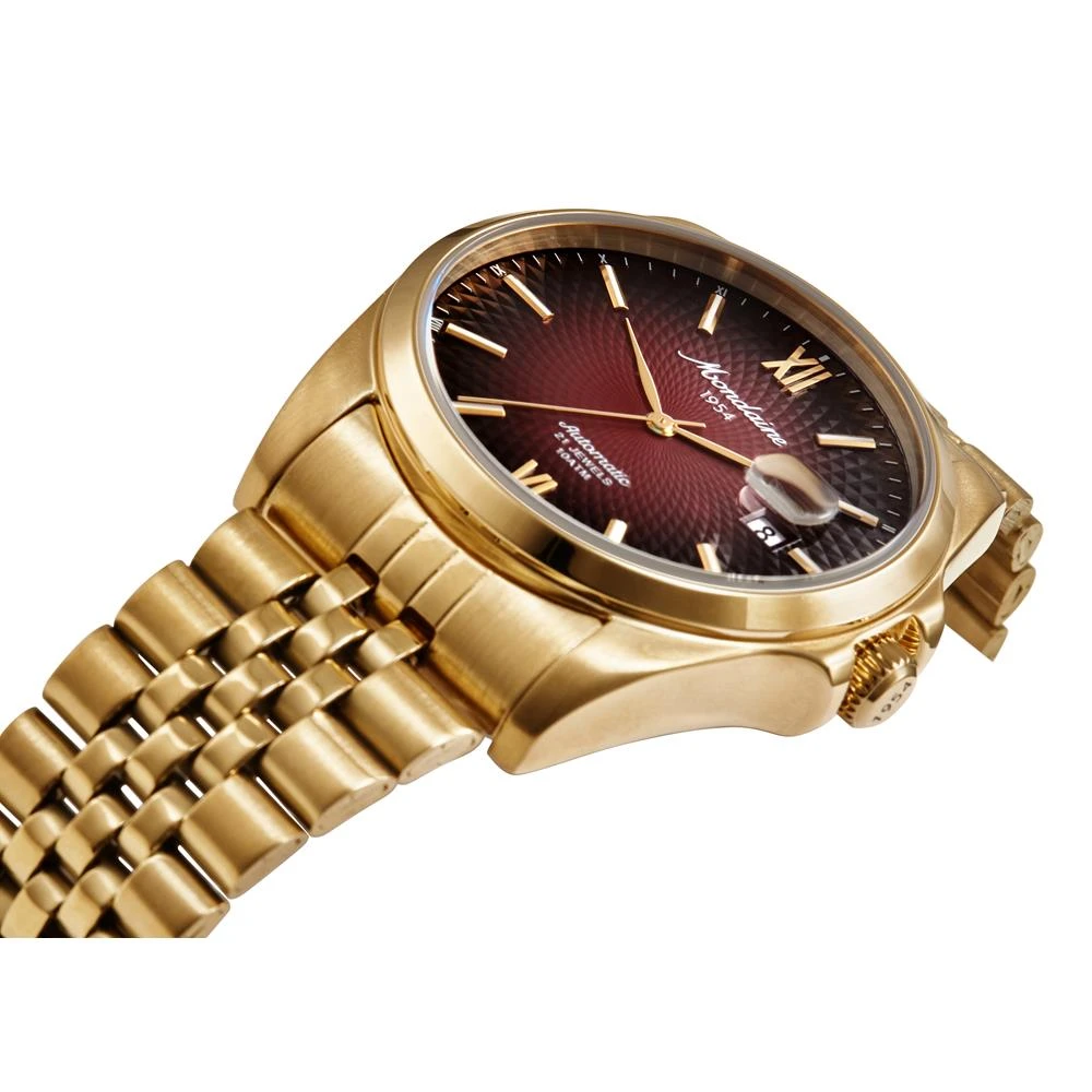 Caixa de Aço InoxidávelPulseira de Aço InoxidávelVidro de Cristal MineralFundo RosqueadoResistente à Água 10 AtmDiâmetro / Largura da Caixa: 40.00 MMAltura da Caixa: 12.00 MMFunção: Automático, Calendário com lupaMostrador Vinho Degradê com Algarismos Romanos e Inscrição Mondaine 1954 (Logo Clássica da marca)Alimentação do Maquinário: Mecânico (Automático)Garantia de 1 Ano