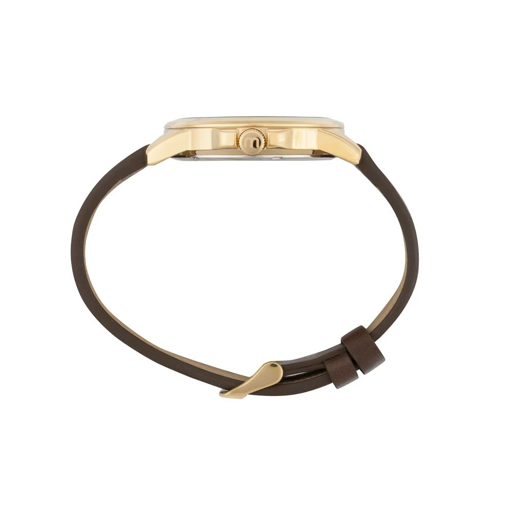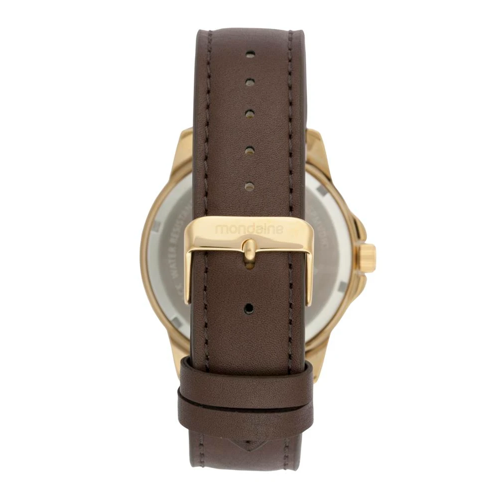 Caixa de MetalPulseira de Couro Ecológico MarromVidro de Cristal MineralFundo RosqueadoResistente à Água 5 AtmDiâmetro / Largura da Caixa: 44.00 MMFunção: AnalógicoMostrador Dourado com númerosAlimentação do Maquinário: BateriaGarantia de 1 Ano