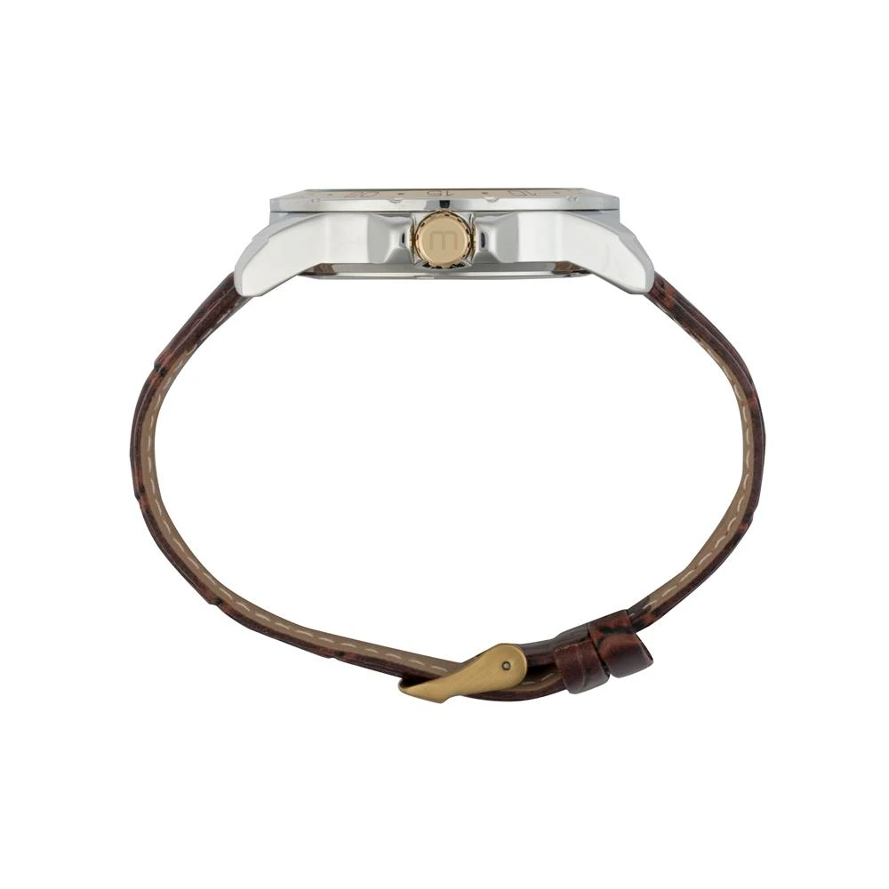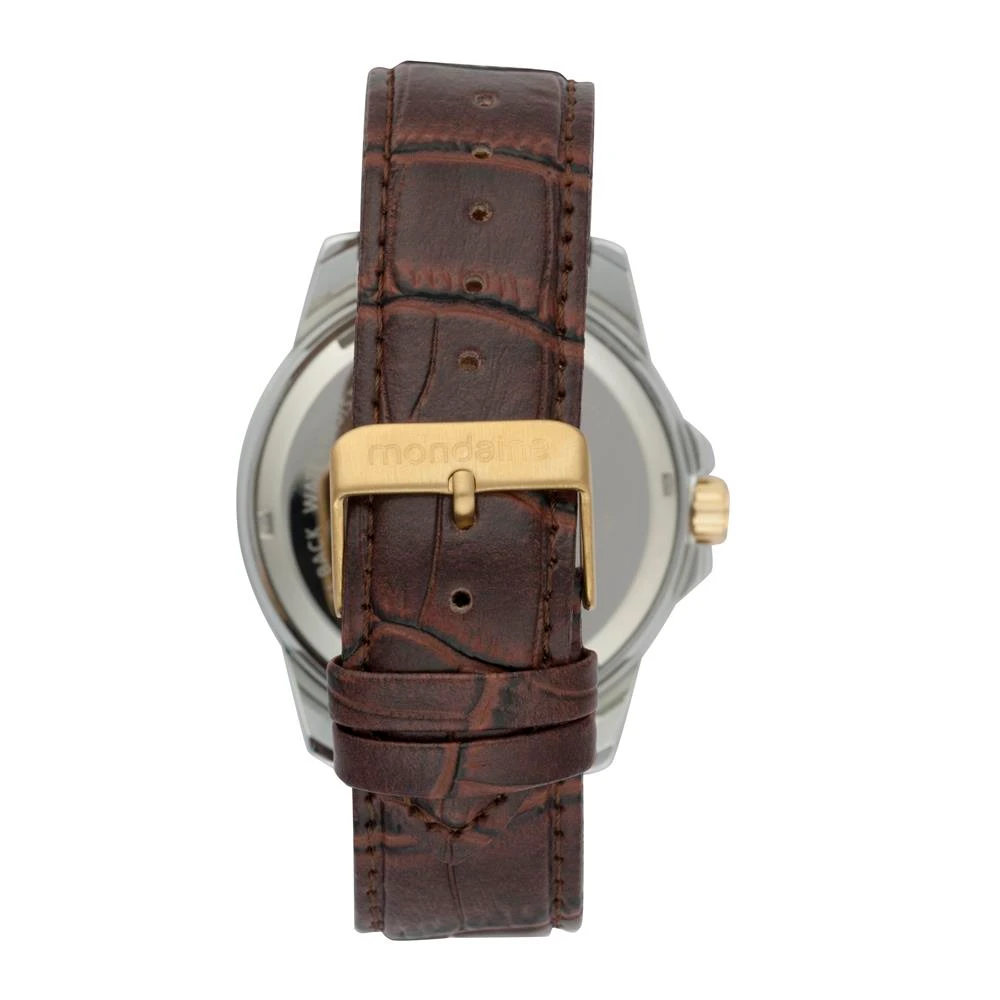 Caixa de MetalPulseira de Couro Ecológico MarromVidro de Cristal MineralFundo RosqueadoResistente à Água 5 AtmDiâmetro / Largura da Caixa: 44.00 MMFunção: Analógico, CalendárioMostrador marrom com númerosAro Fixo DouradoPrateado com DouradoAlimentação do Maquinário: BateriaGarantia de 1 Ano