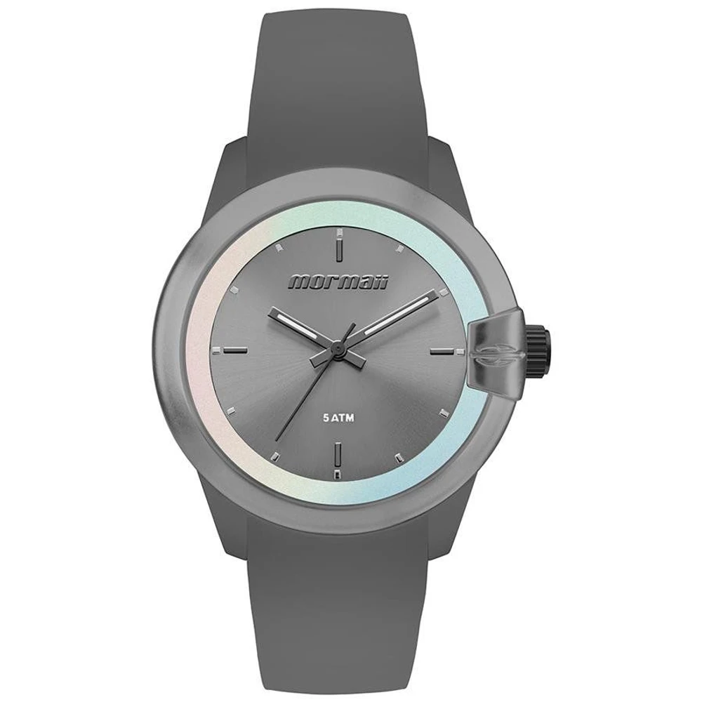 Relógio Mormaii da Linha Maui Lual, ideal para dar uma pitada esportiva no look! Modelo analógio cinza com caixa prata 40mm em polímero e pulseira de silicone com toque confortável. Item com aro interno em furtacor e a prova dágua 50m.