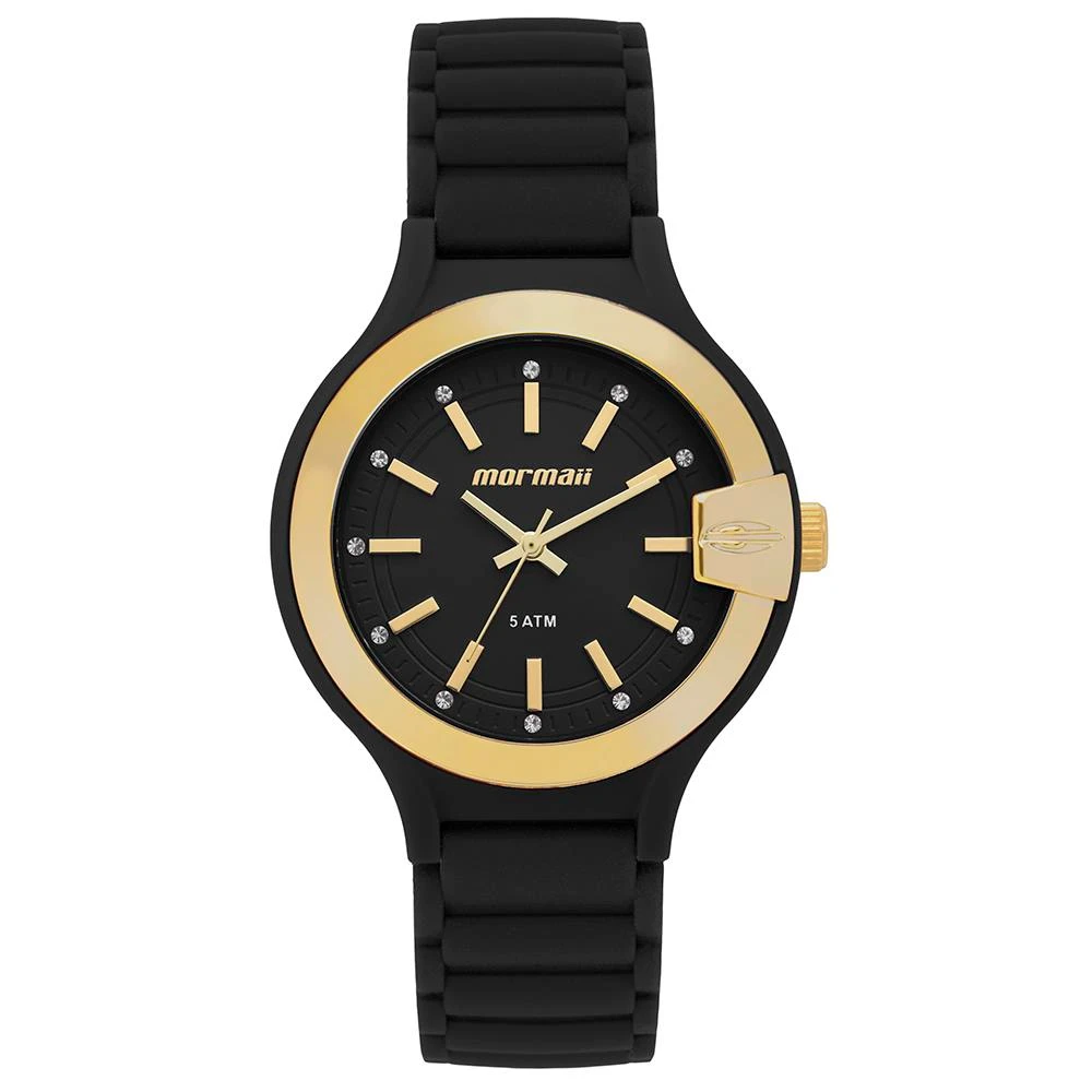 Caixa de Polímero PretaPulseira de Silicone PretaFundo ParafusadoResistente à Água 5 ATMDiâmetro / Largura da Caixa: 38.00 MMFunções: AnalógicoVidro: AcrílicoMostrador Preto com detalhes em douradoAro Externo Fixo DouradoAlimentação do Maquinário: BateriaGarantia de 1 Ano