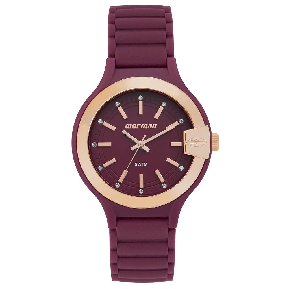 Caixa de Polímero VinhoPulseira de Silicone VinhoFundo ParafusadoResistente à Água 5 ATMDiâmetro / Largura da Caixa: 38.00 MMFunções: AnalógicoVidro: AcrílicoMostrador Vinho com detalhes em douradoAro Externo Fixo DouradoAlimentação do Maquinário: BateriaGarantia de 1 Ano