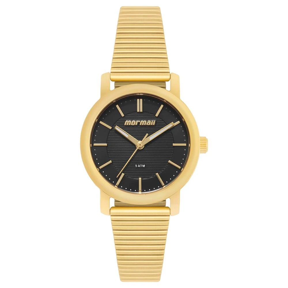 Caixa de Aço InoxidávelPulseira de Aço InoxidávelFundo de PressãoResistente à Água 5 ATMDiâmetro / Largura da Caixa: 32.00 MMFunções: AnalógicoVidro: Cristal MineralMostrador Preto com detalhes em DouradoAlimentação do Maquinário: BateriaGarantia de 1 Ano