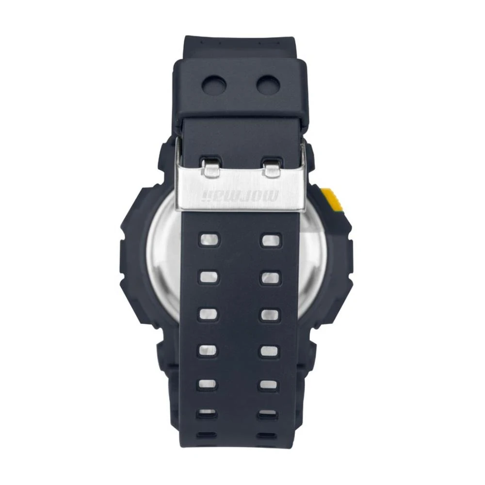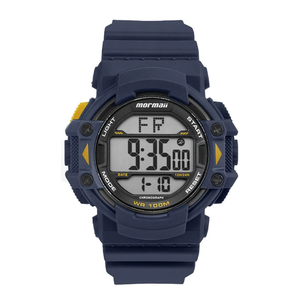 Caixa de Polímero Azul com detalhe laranjaPulseira de Poliuretano AzulFundo de Aço ParafusadoResistente à Água 10 ATMDiâmetro / Largura da Caixa: 50.00 MMFunções: Digital, Alarme, Cronógrafo, IluminaçãoVidro: AcrílicoMostrador Preto com detalhes brancosAlimentação do Maquinário BateriaGarantia de 1 Ano