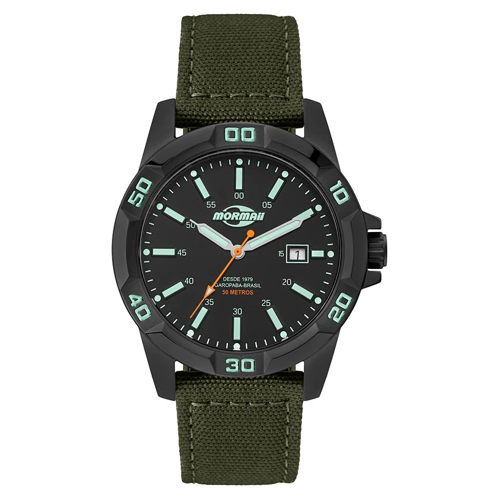 Caixa de Aço InoxidávelPulseira de Couro Legítimo Preto Revestido de Tecido VerdeFundo de Pressão em AçoResistente à Água 5 ATMDiâmetro / Largura da Caixa: 44.00 MMFunções: Analógico, CalendárioVidro: Cristal MineralAro Fixo Preto com números (indicadores dos minutos)Alimentação do maquinário BateriaMostrador PretoMaquinário JaponêsGarantia de 1 Ano